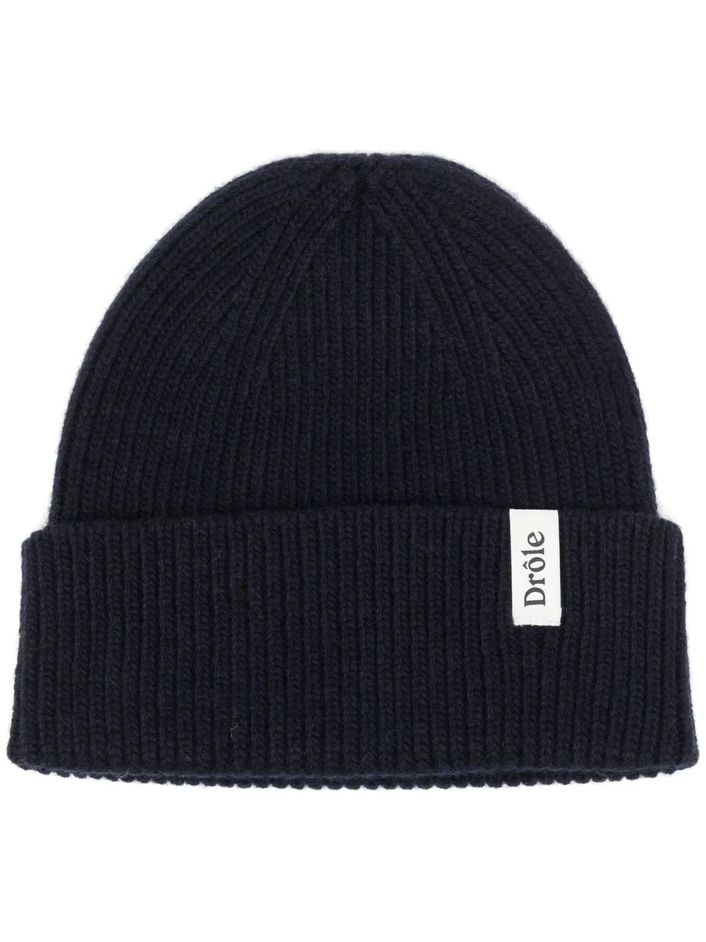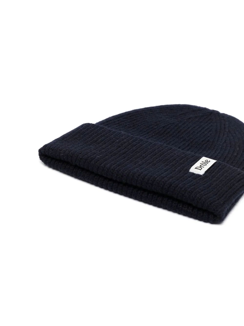 Azul marino, lana, estructura de punto, punto grueso, ala con vuelta y parche del logo en la parte delantera.