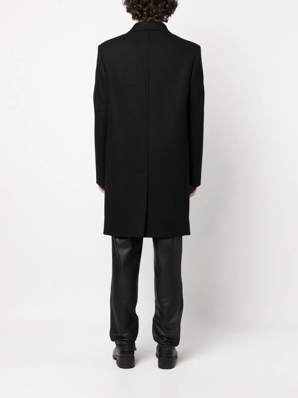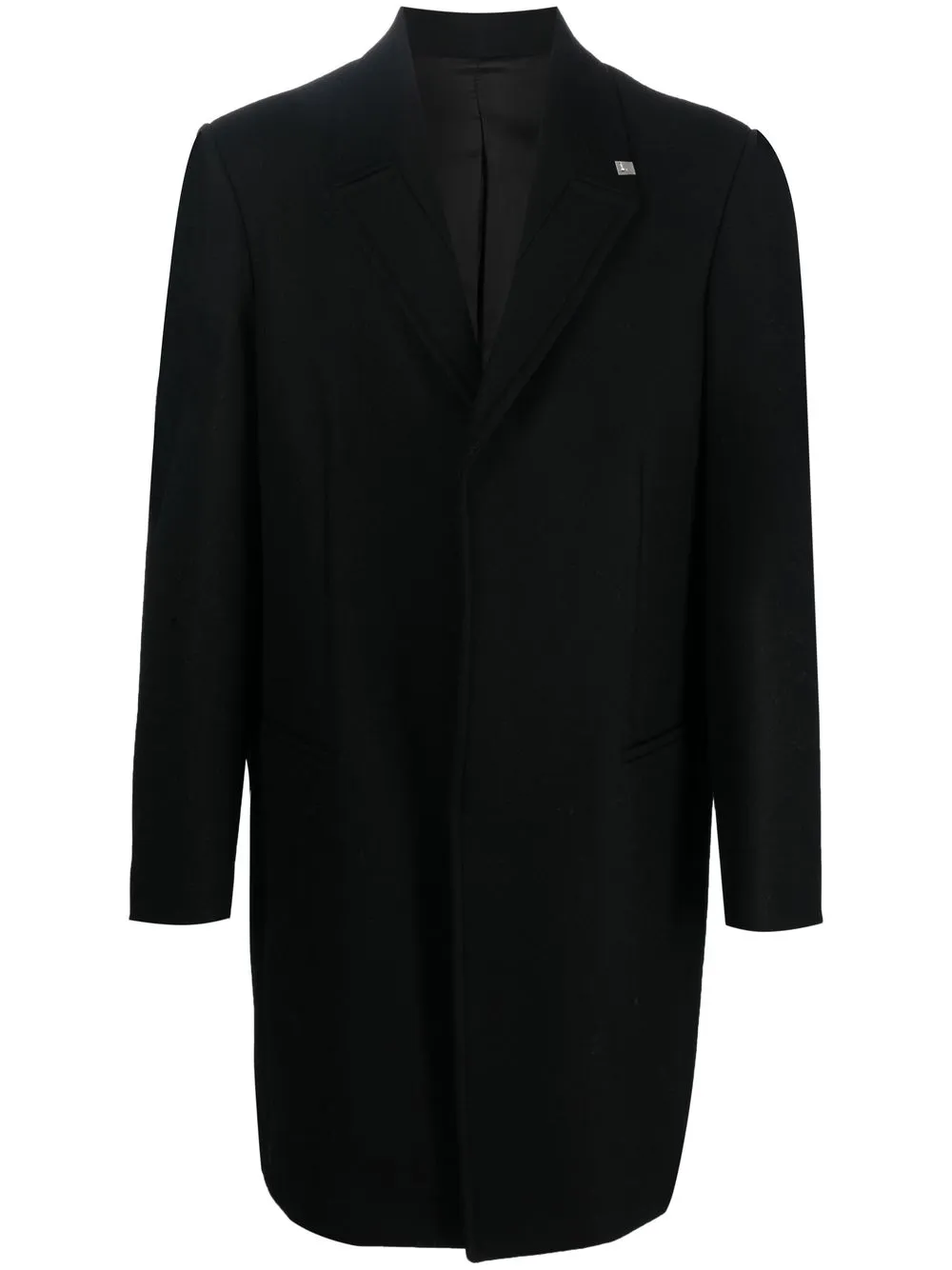 Negro, mezcla de lana, algodón, solapas de muesca, cierre oculto en la parte delantera, manga larga, abertura central en la parte posterior y largura media.