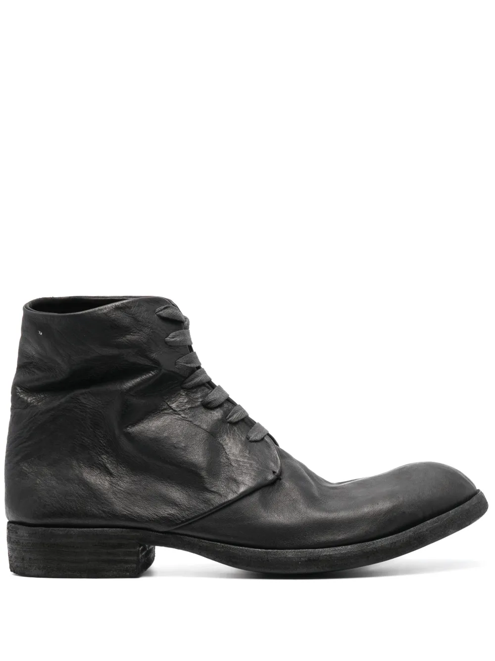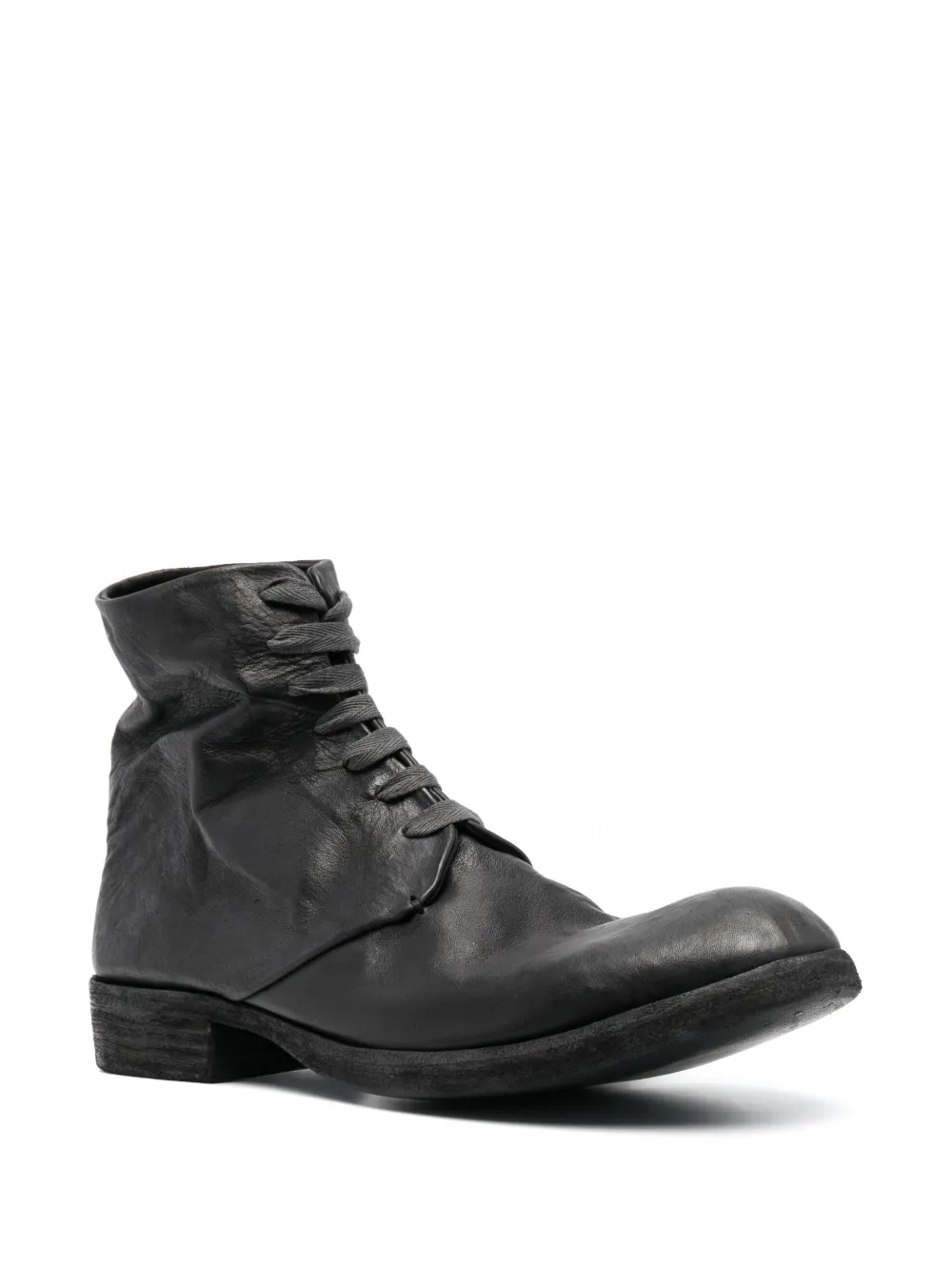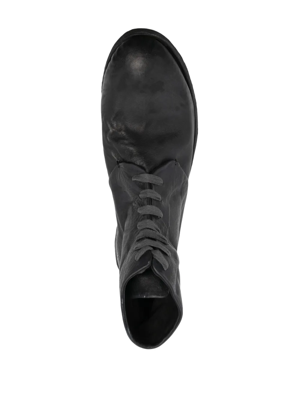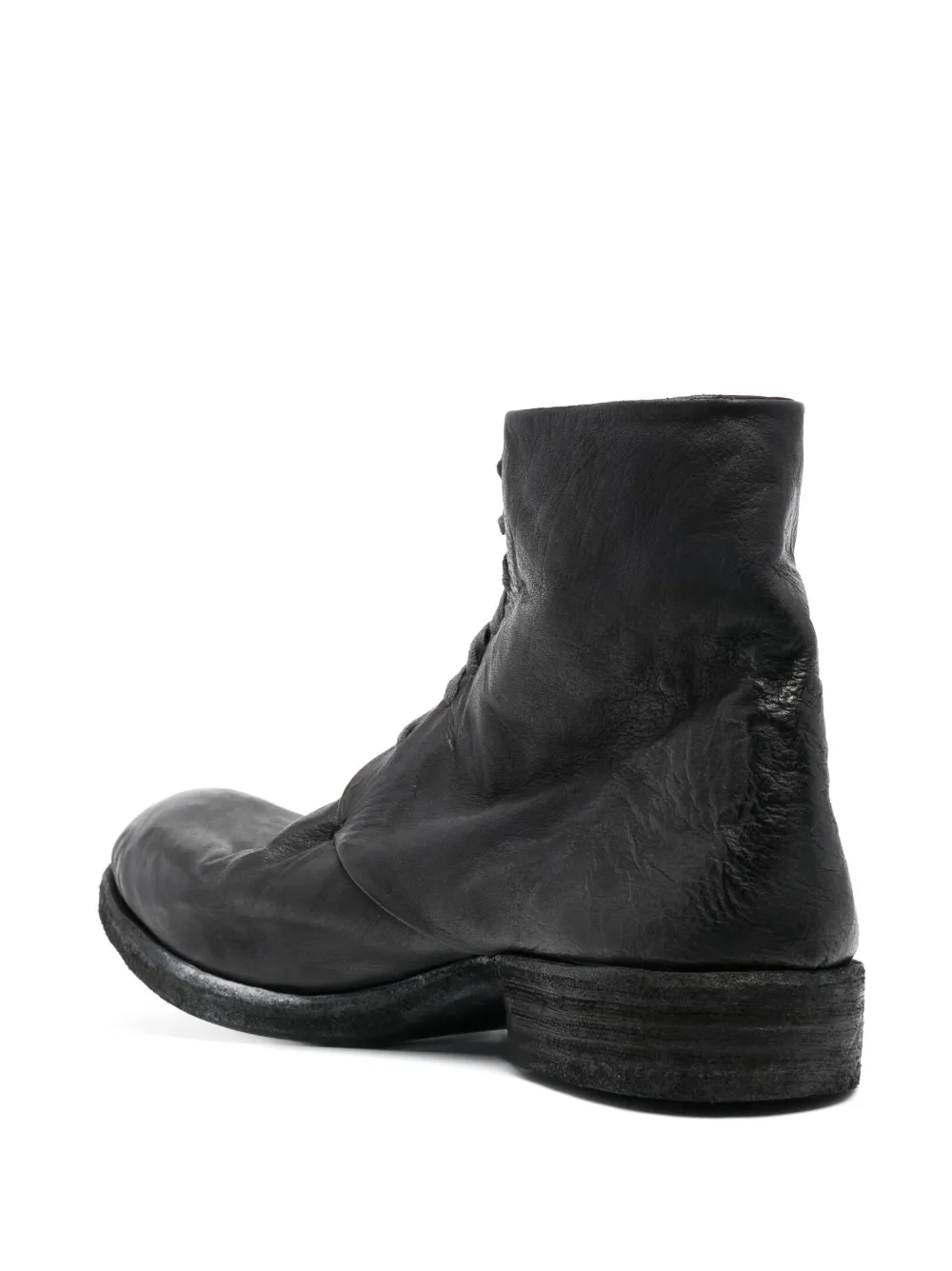 Negro, piel de becerro, puntera redonda, cierre con cordones en la parte delantera, diseño por el tobillo y suela de cuero.