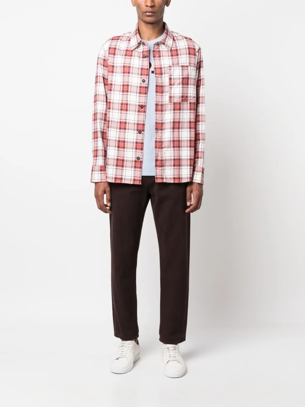 Motivo a cuadros, cuello clásico, cierre con botones en la parte delantera, manga larga, puños con botón y dobladillo recto.