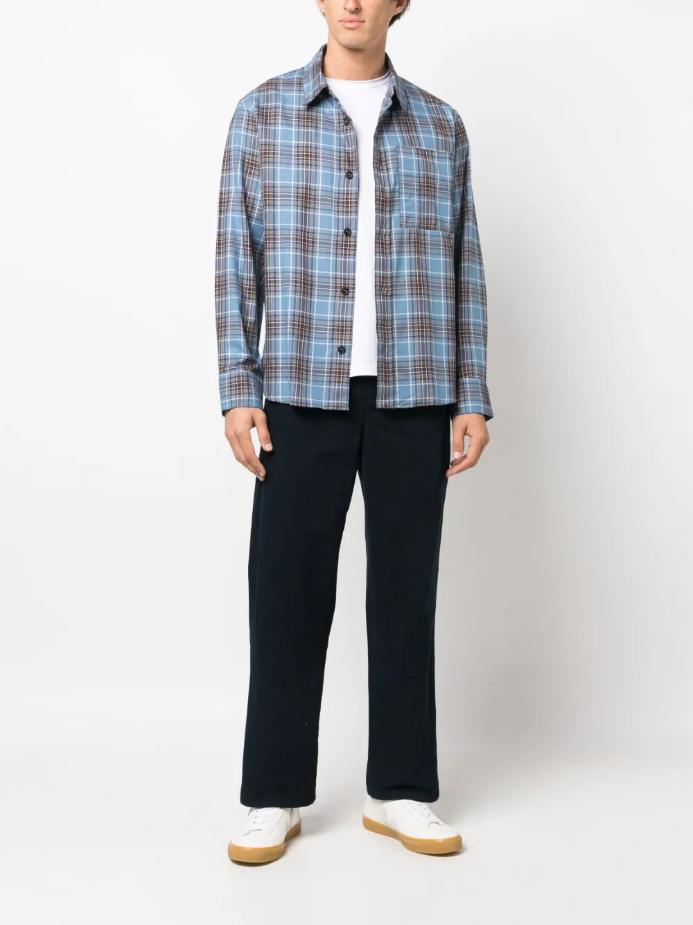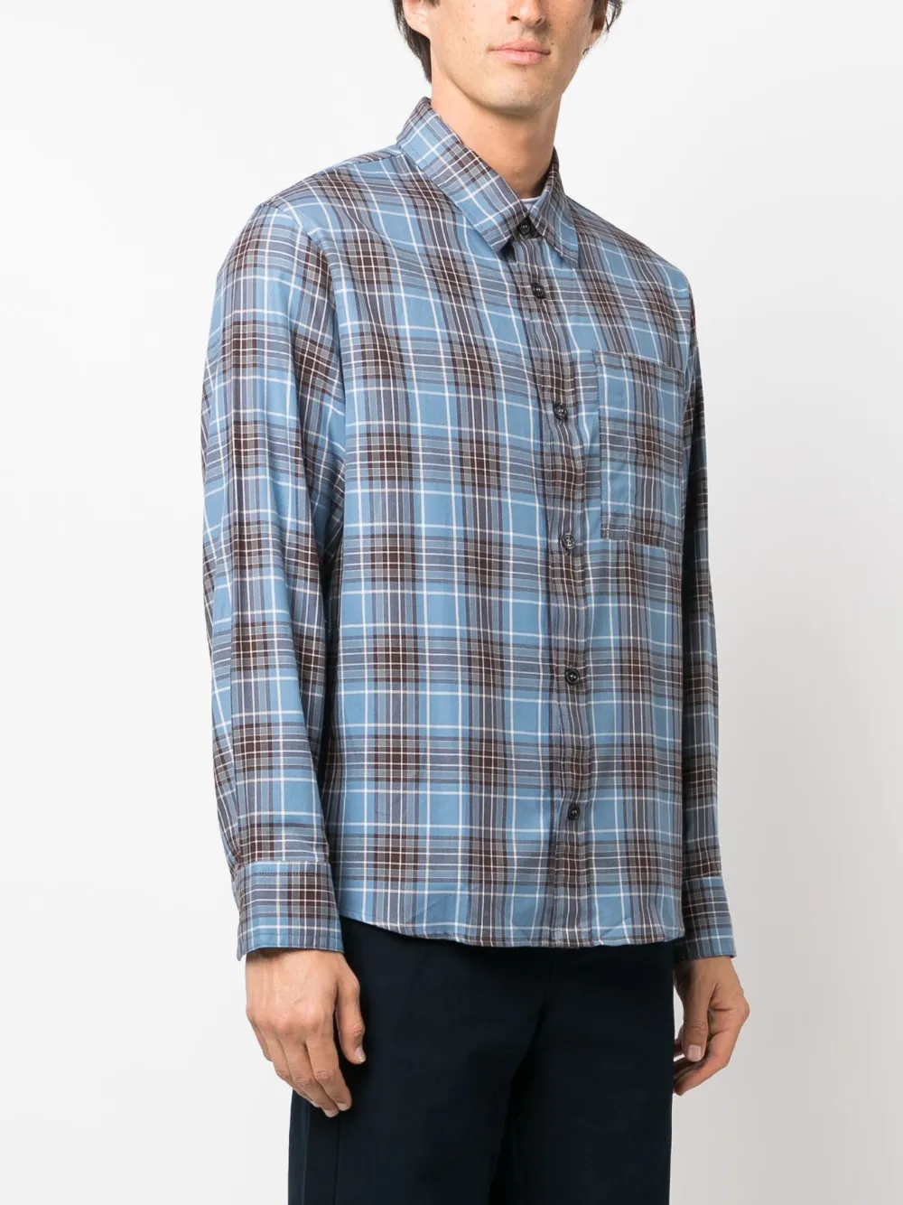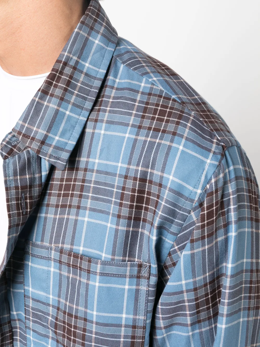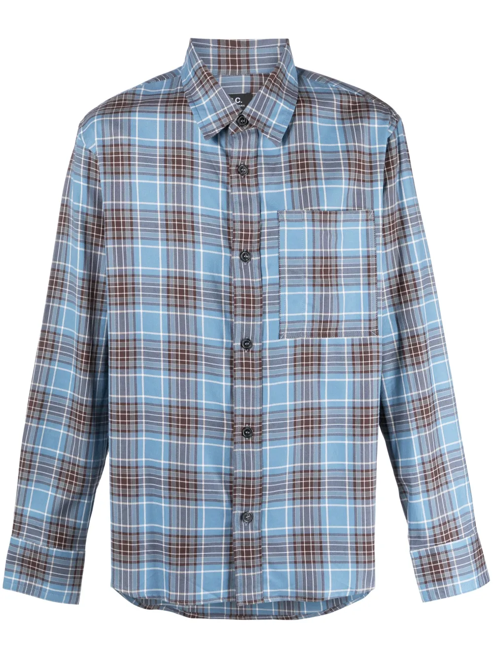 Azul claro, marrón chocolate, blanco roto, algodón, tejido de sarga, estampado a cuadros, cuello recto de pico, cierre con botones en la parte delantera, manga larga, puños con botón, bolsillo de parche en el pecho y dobladillo redondeado.