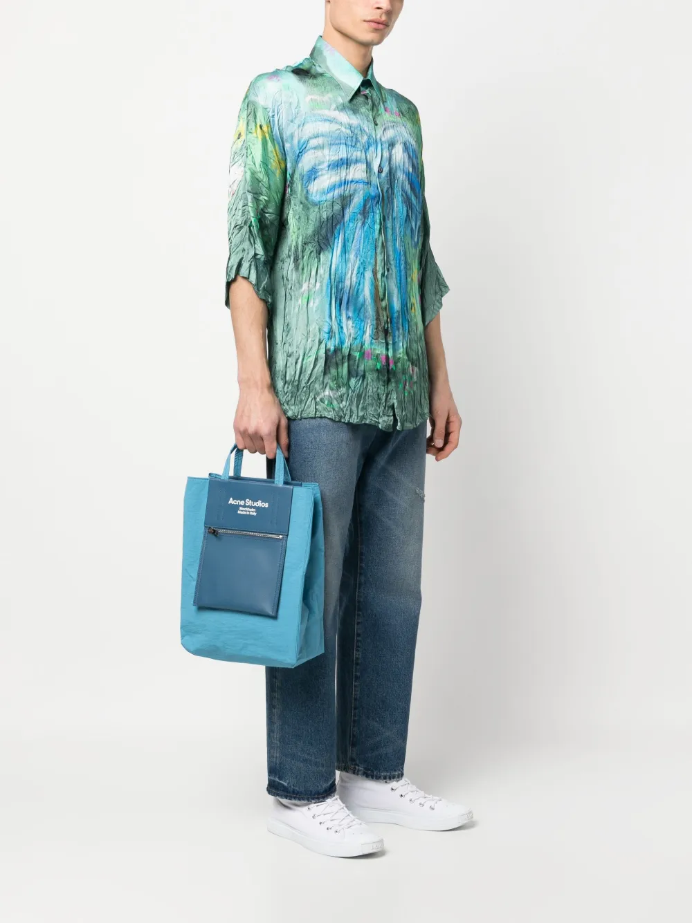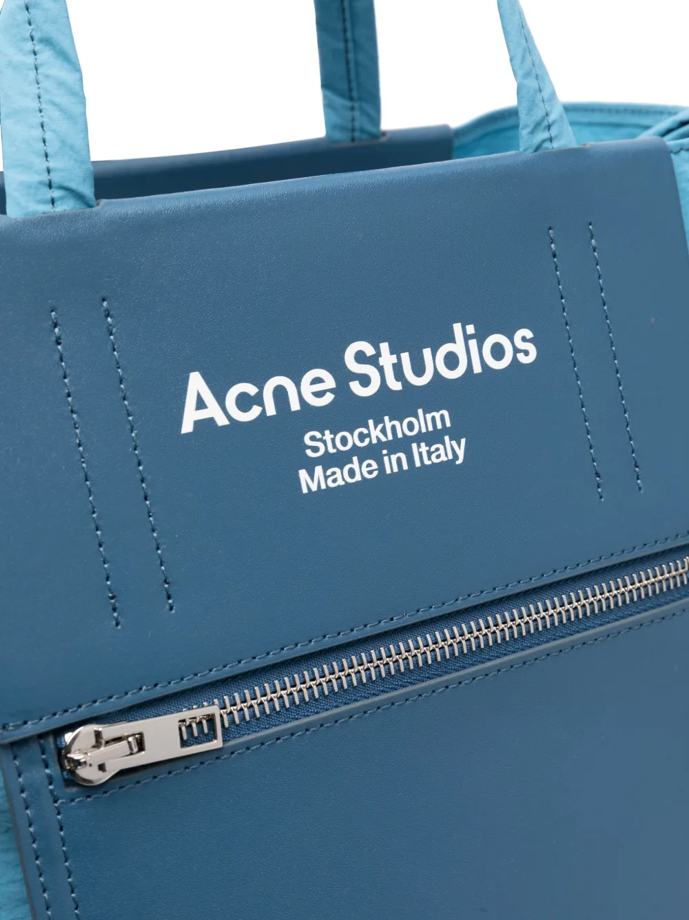 Azul palo, piel de becerro, estampado del logo en la parte delantera, bolsillo con cremallera en la parte delantera y correa ajustable y removible para el hombro.