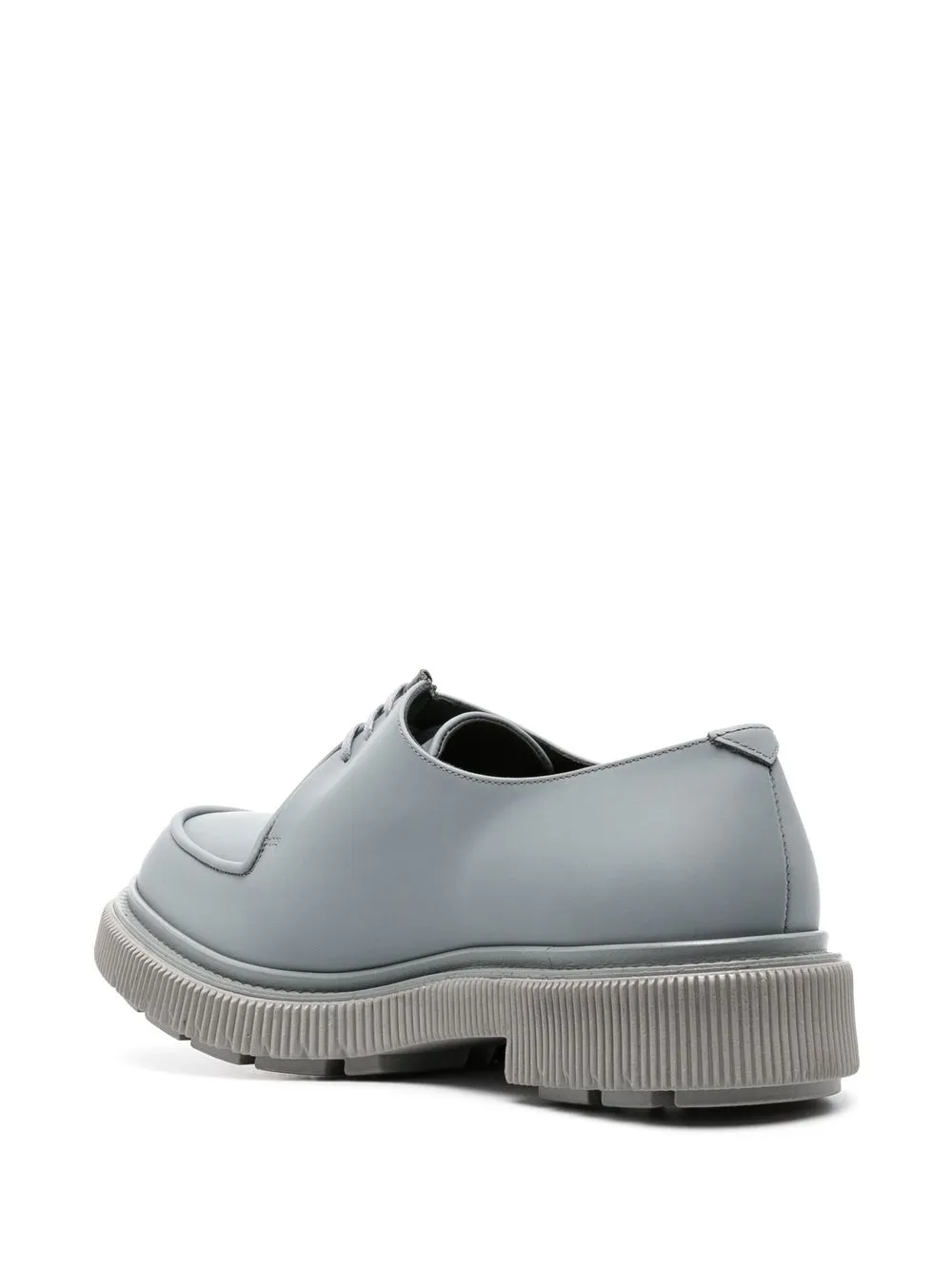 Gris pizarra, piel de becerro, suela de plataforma, puente en relieve, cierre con cordones en la parte delantera, plantilla de piel con logo y puntera redonda.