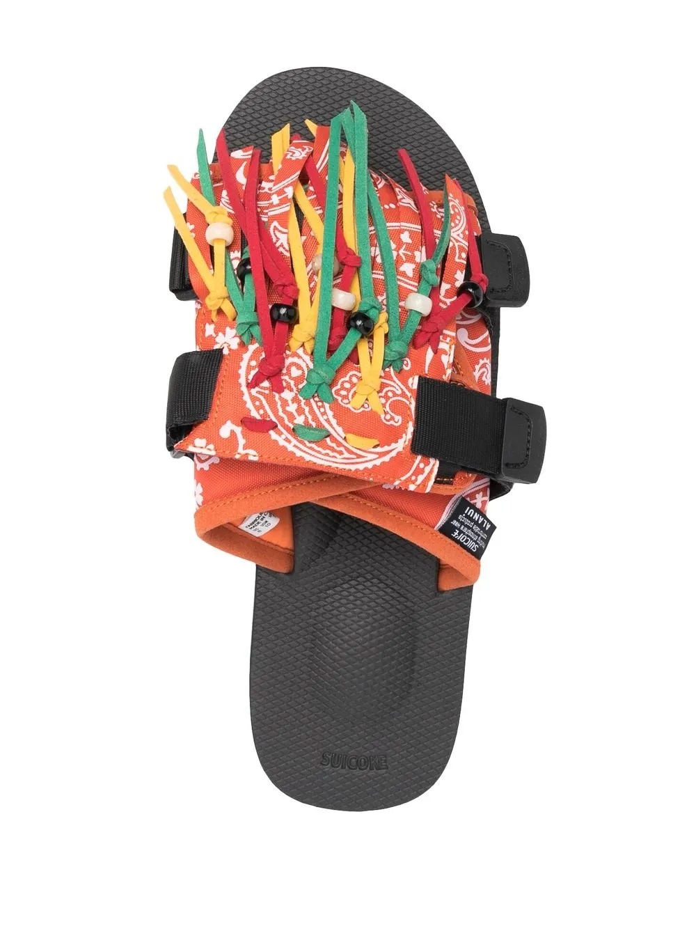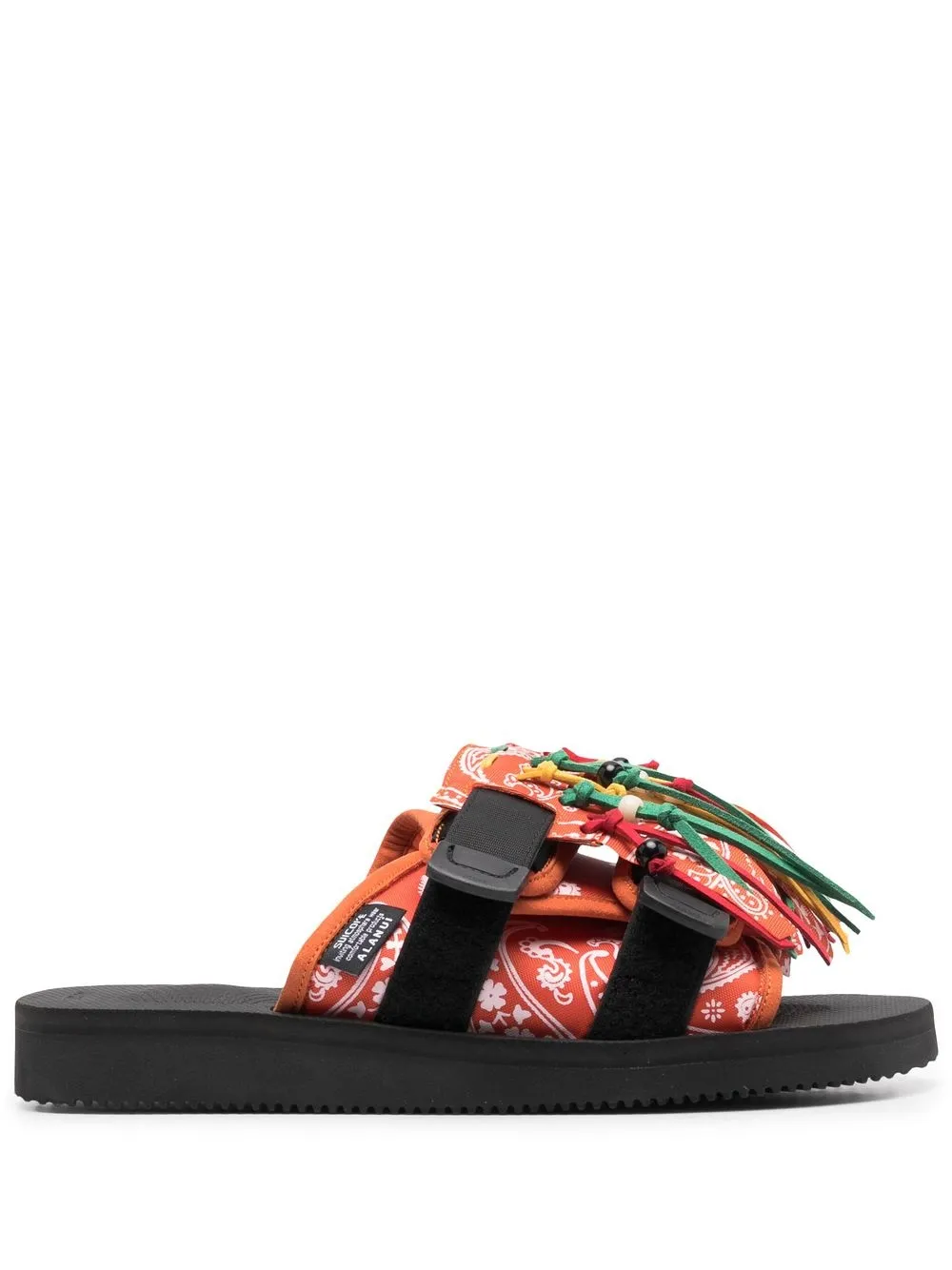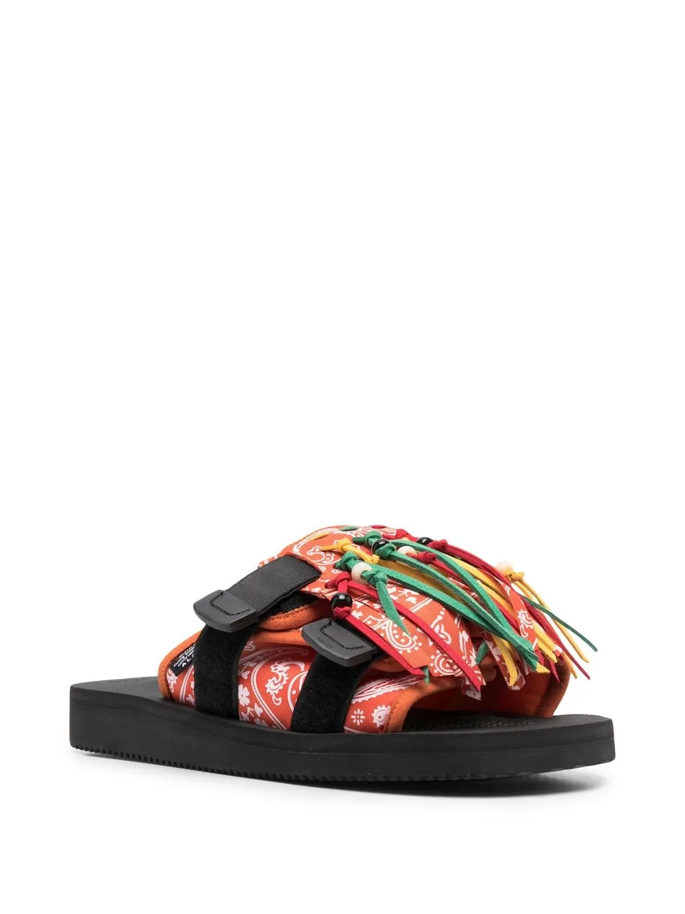 Estampado de pañuelo, detalle de flecos, cierre autoadherente en la parte delantera, puntera abierta y suela plana de goma.