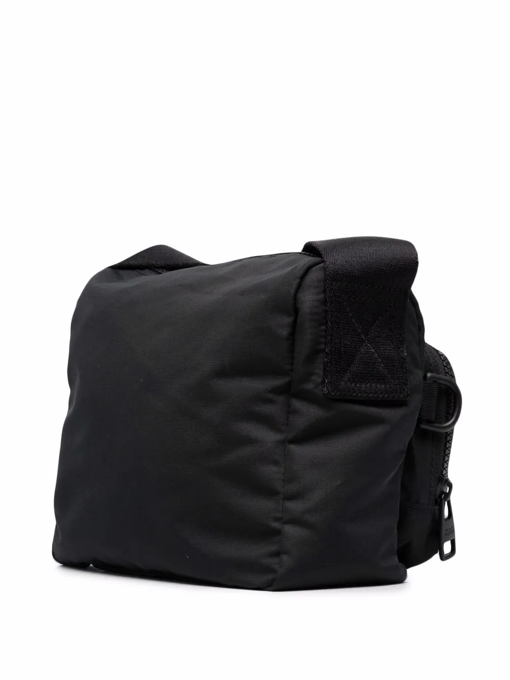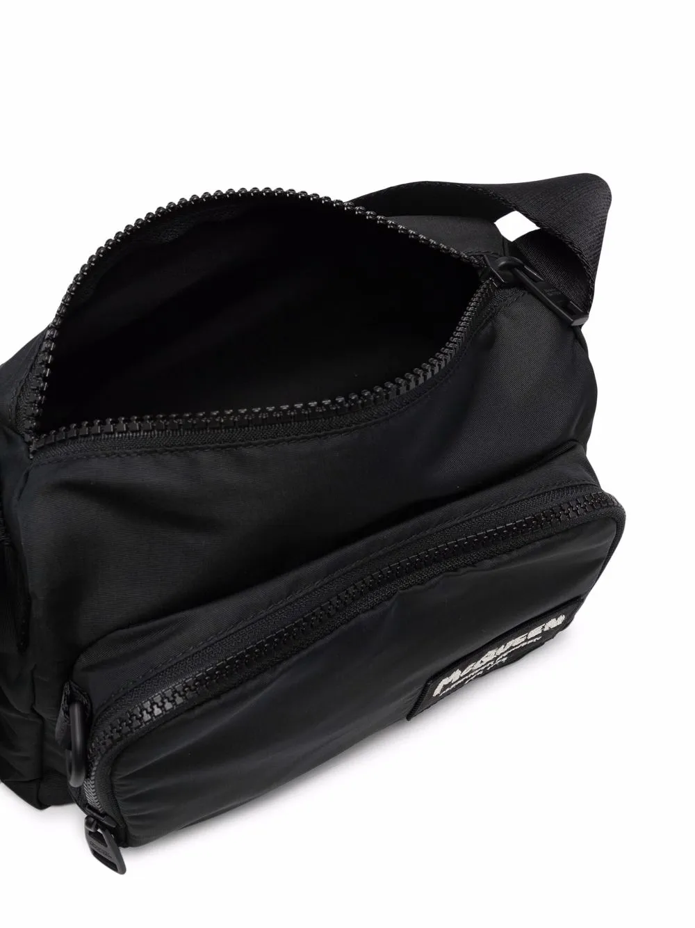 Parche del logo en la parte delantera, diseño con un único tirante, compartimento frontal con cremallera y cierre con cremallera en la parte delantera.