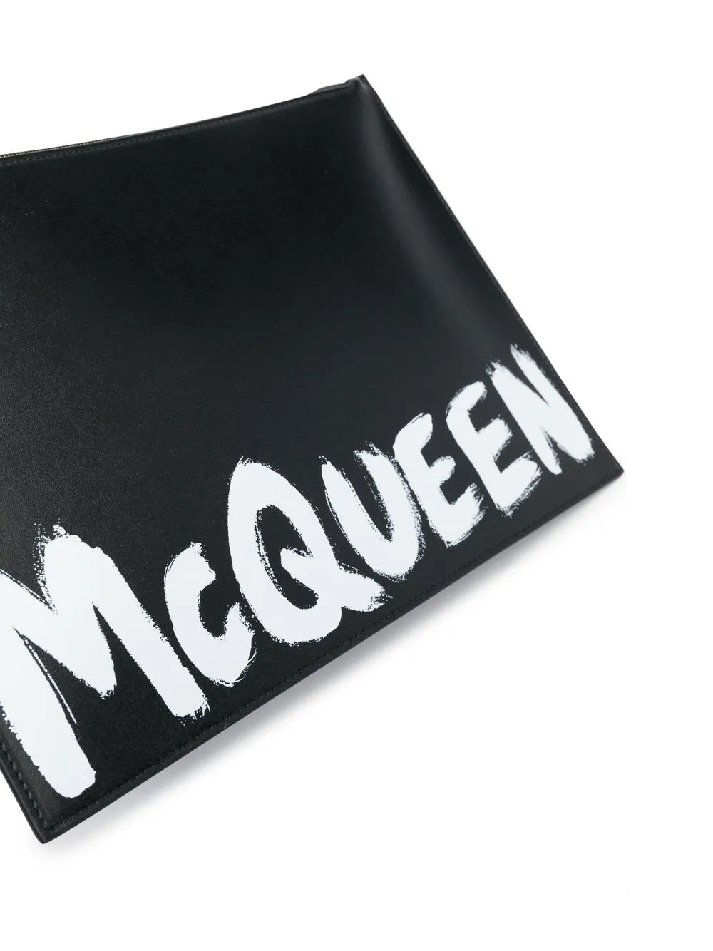 Negro y blanco, piel de becerro, estampado del logo en la parte delantera, cierre con cremallera en el tope y compartimento principal.