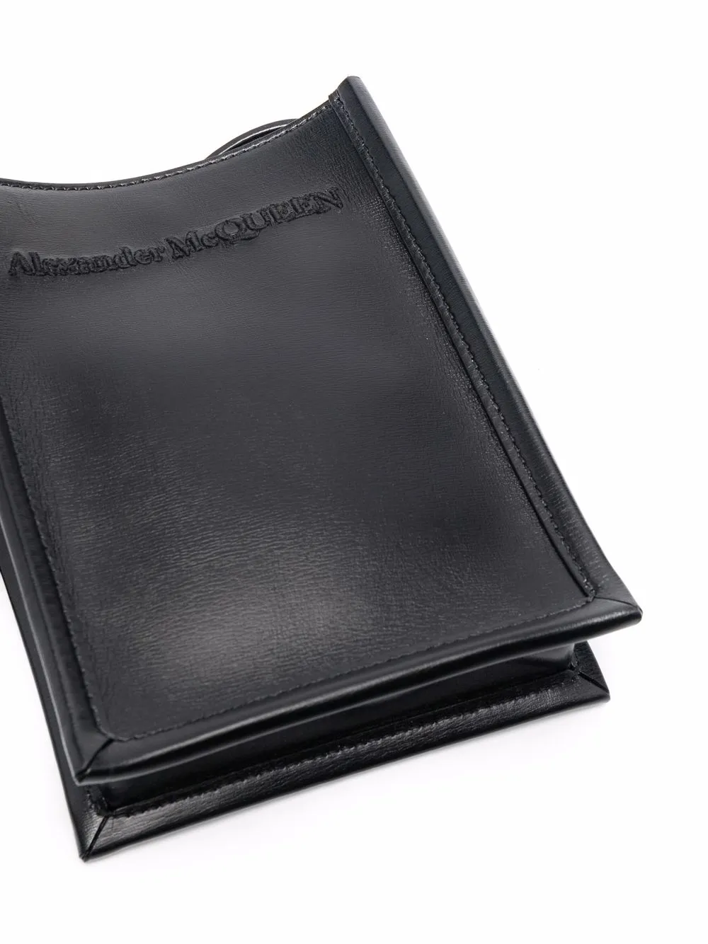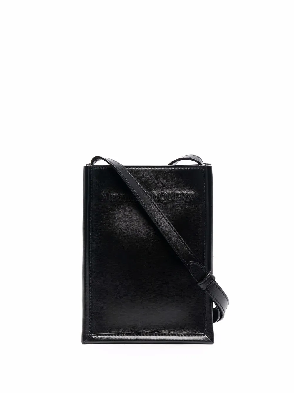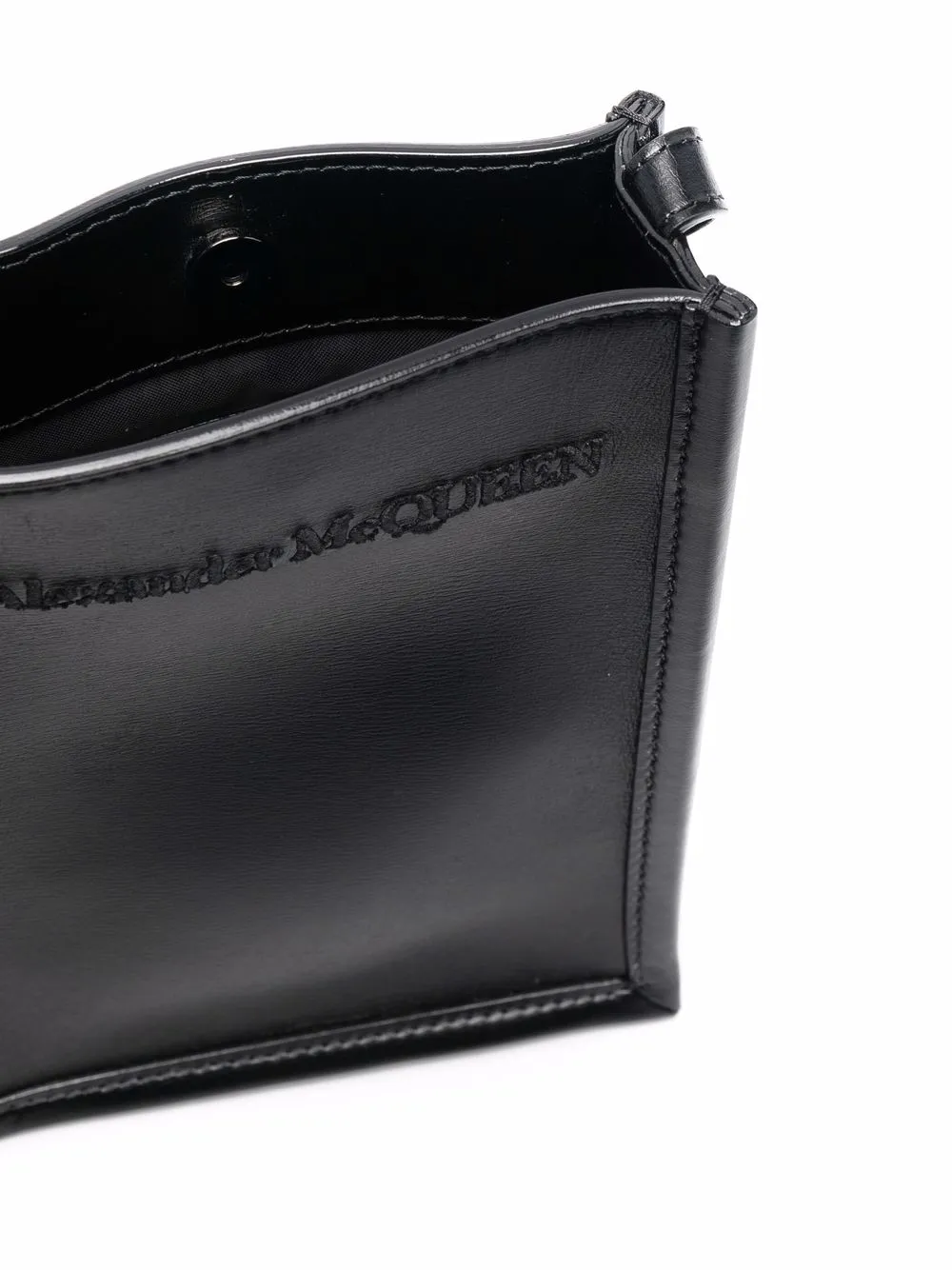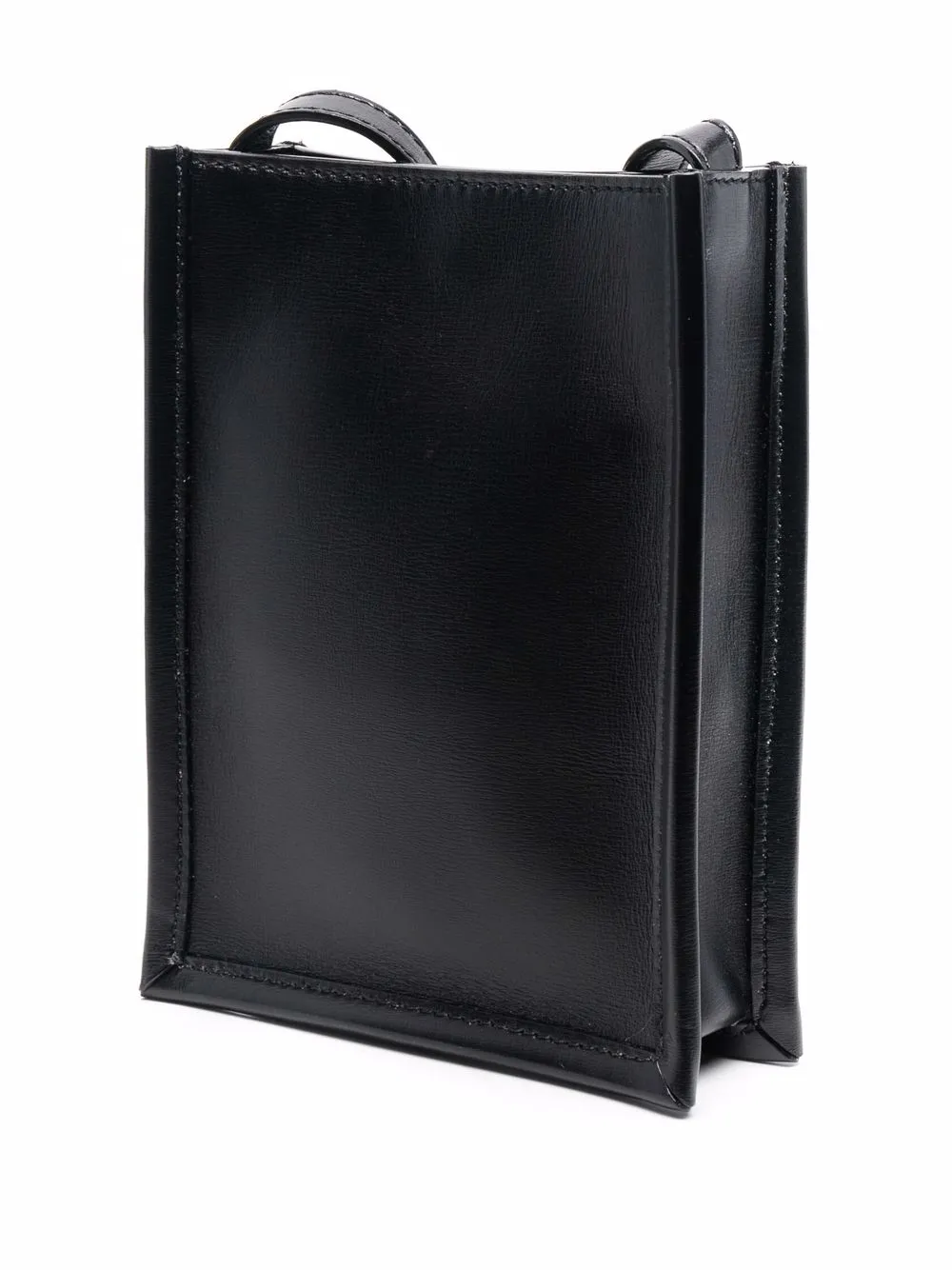 Cierre con botón a presión, correa de hombro ajustable y compartimento principal. Material: cuero.