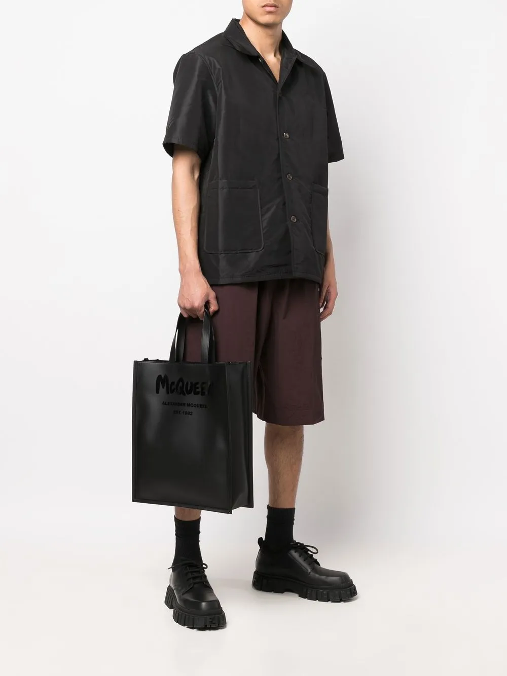 Negro carbón, cuero, estampado del logo en la parte delantera, dos asas redondas en la parte superior, correa de hombro ajustable y compartimento principal.