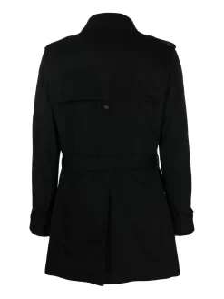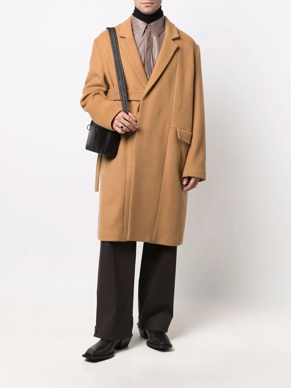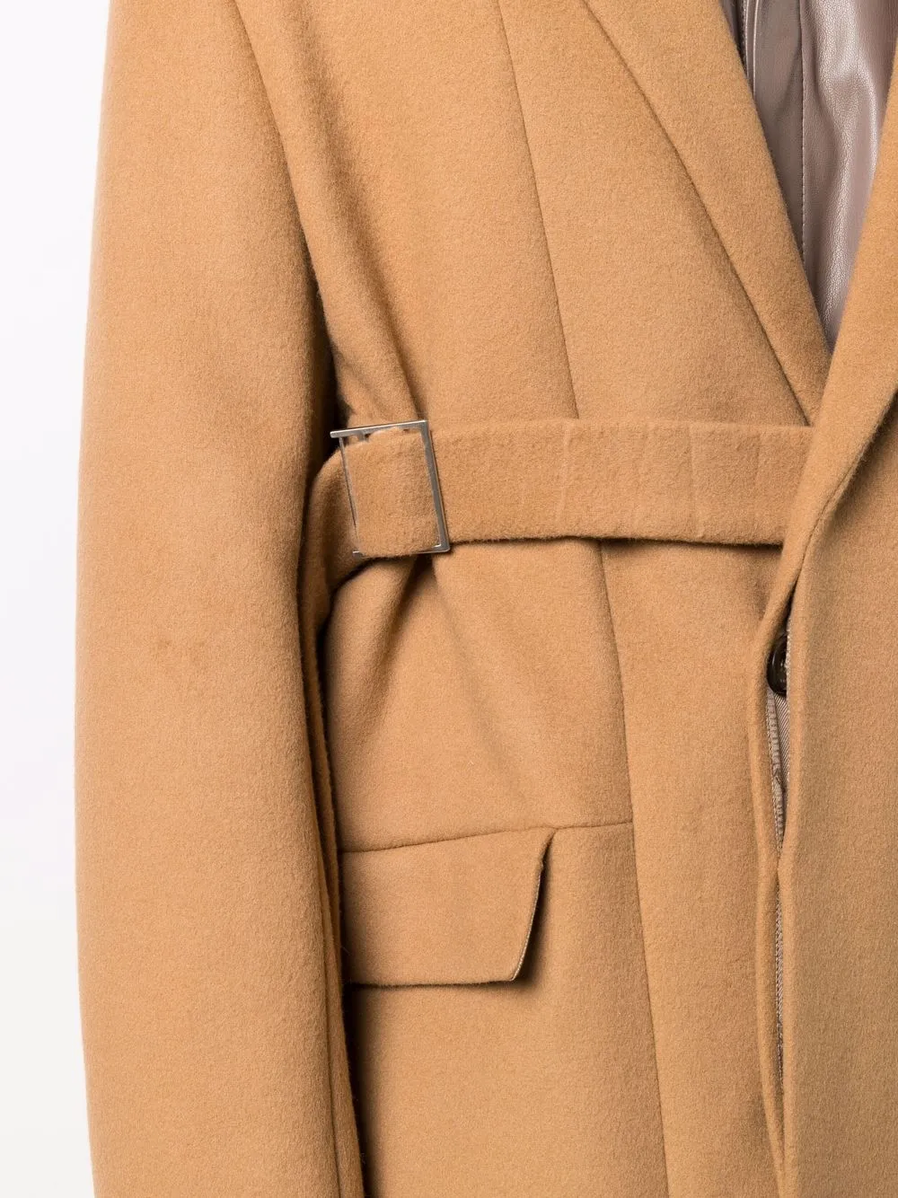 Solapa de muesca, solapas de muesca, detalle de cinturón y dos bolsillos laterales con solapa.