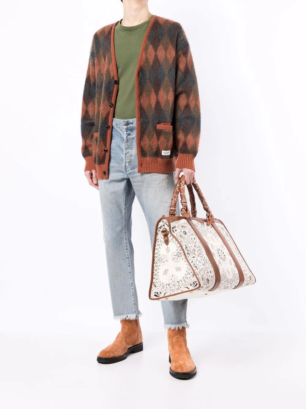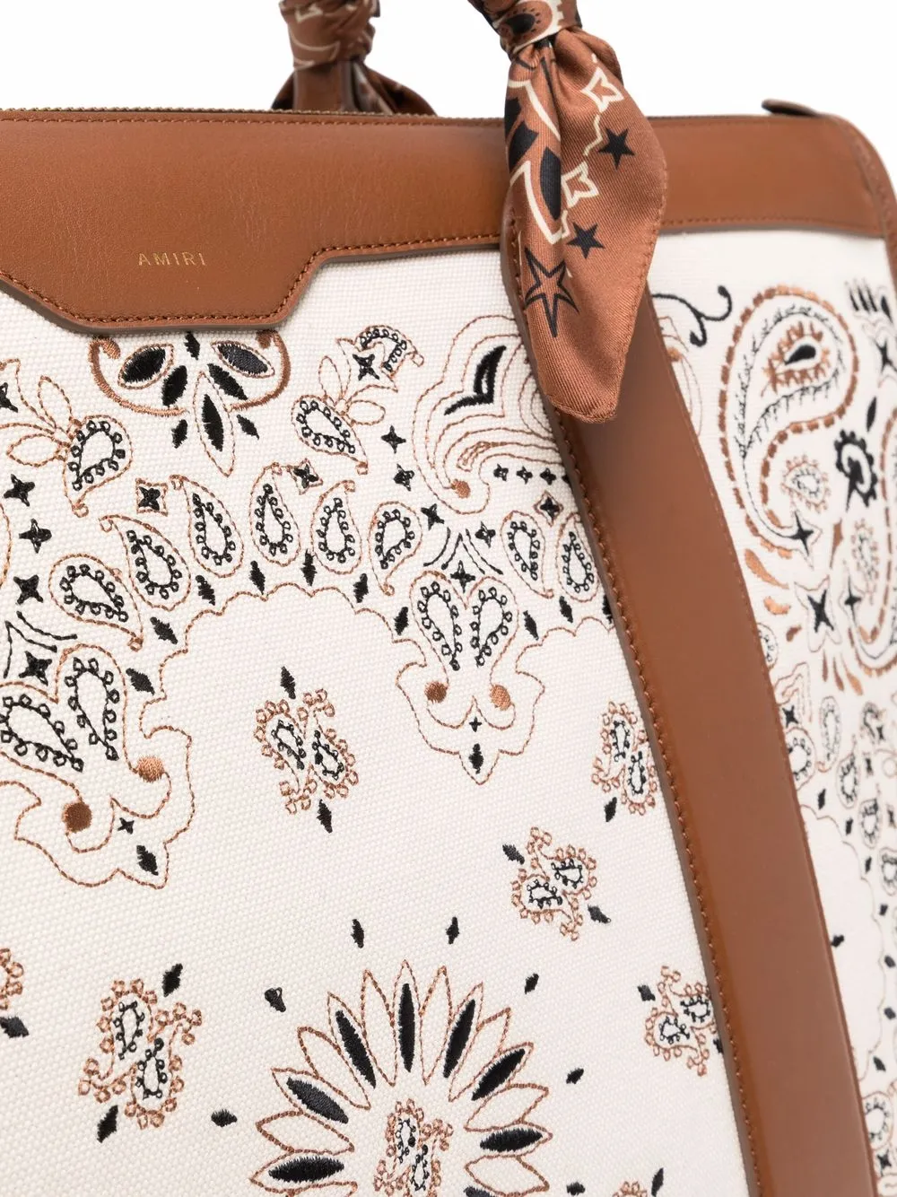 Estampado de pañuelo, logo en relieve en la parte delantera, cierre con cremallera en el tope, correa ajustable y removible para el hombro, asas en la parte superior con pañuelo envuelto, compartimento principal y bolsillo interno con cremallera. Material: cuero.