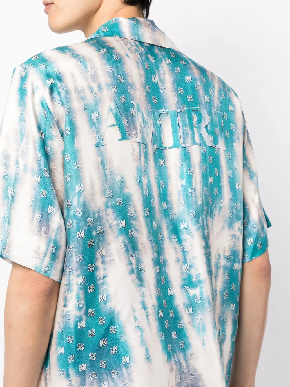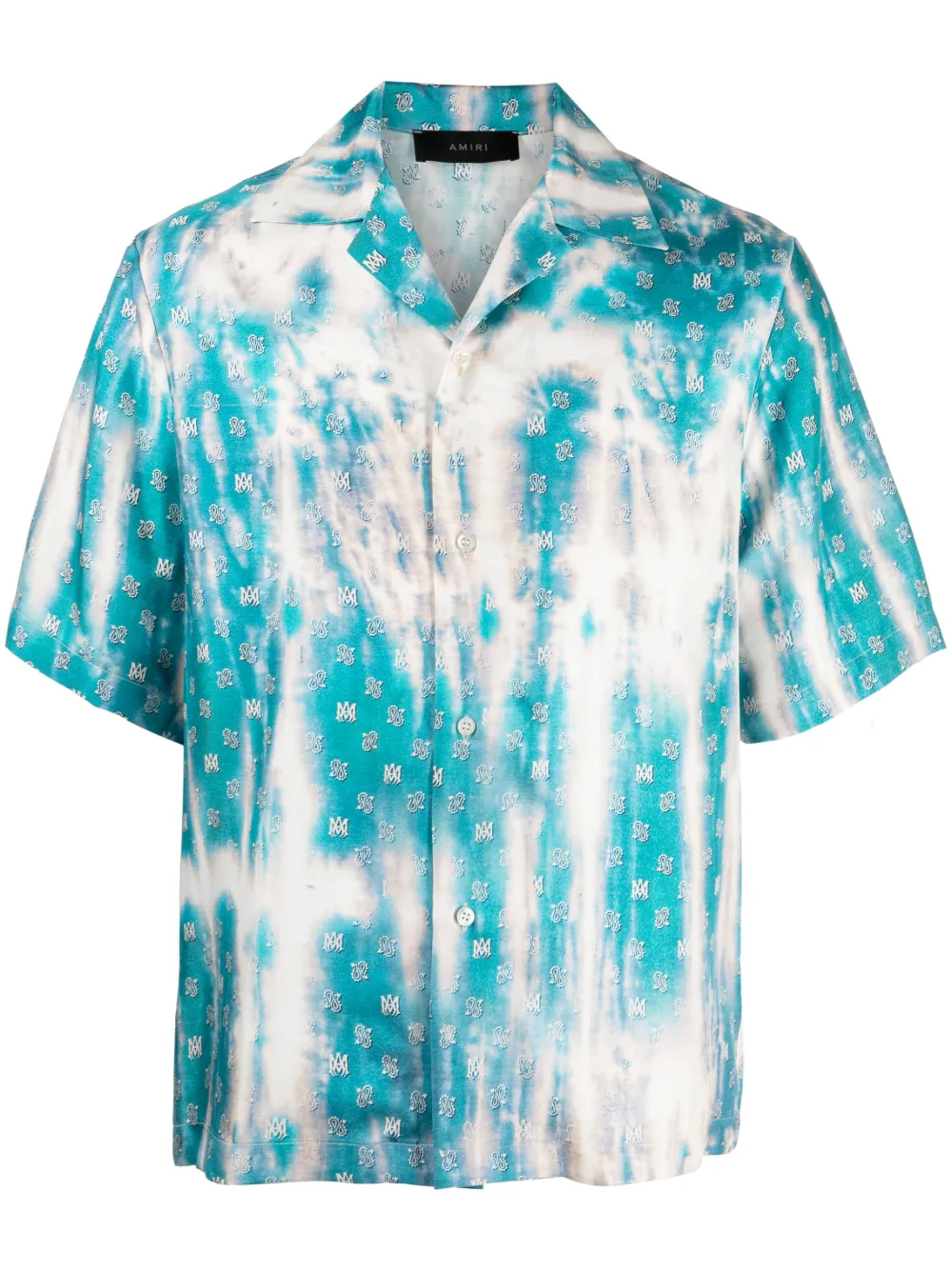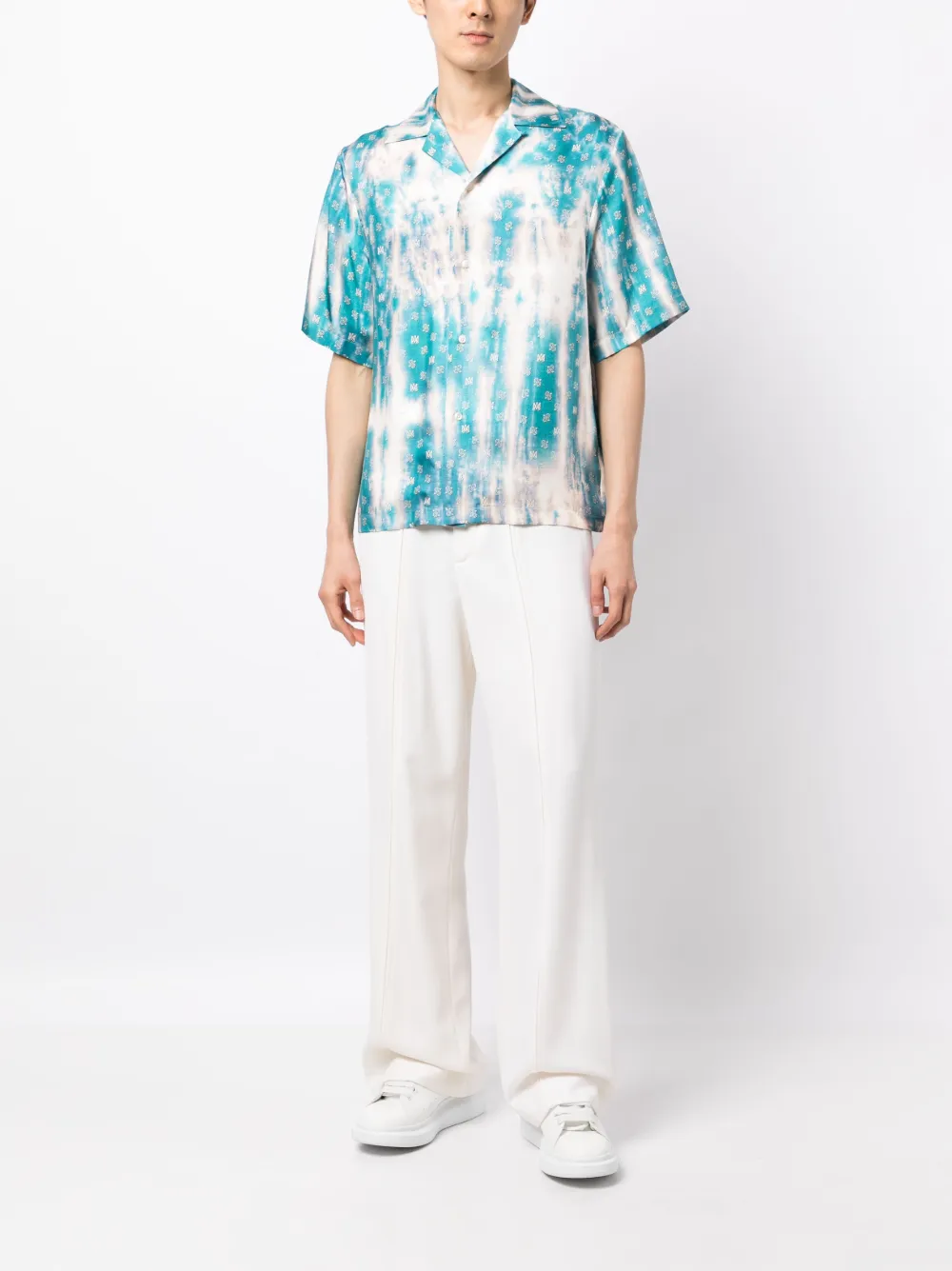 Azul cielo, blanco, seda, estampado de cachemira, motivo tie-dye, logo estampado en la parte posterior, cuello cubano, cierre con botones en la parte delantera, manga corta y dobladillo recto.