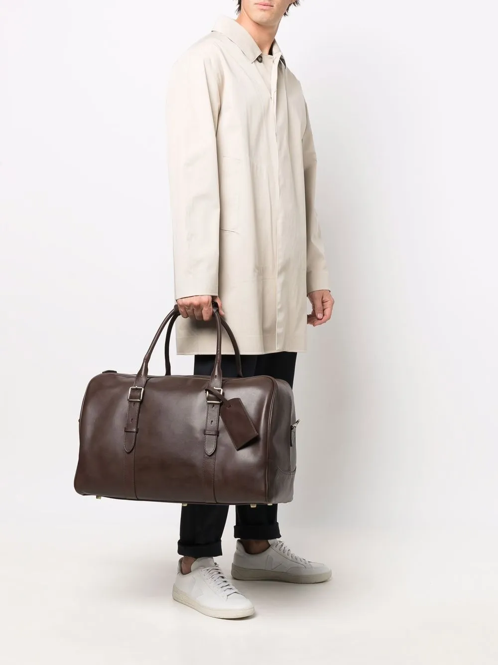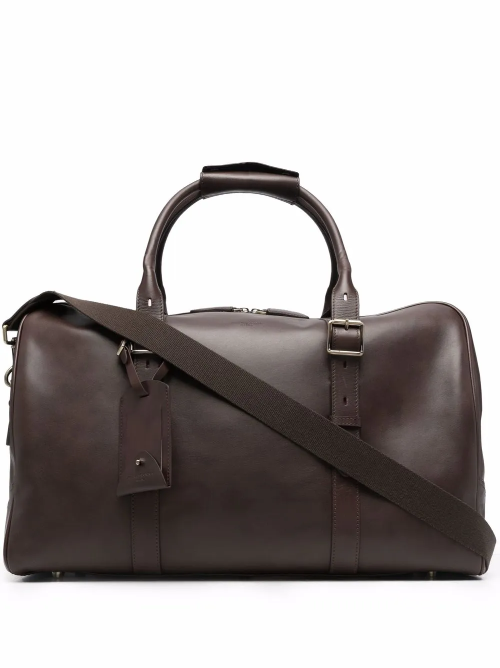 Sello del logo en la parte delantera, acabado en tono dorado, dos asas redondas en la parte superior, correa ajustable y removible para el hombro, cremallera de doble sentido, compartimento principal y bolsillo interno con cremallera. Material: cuero.