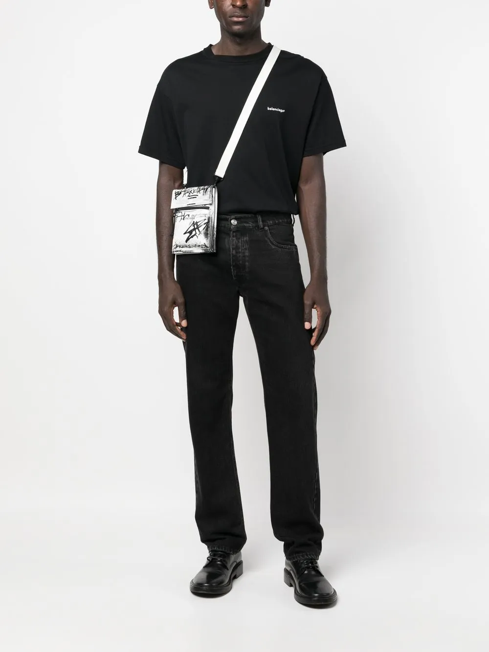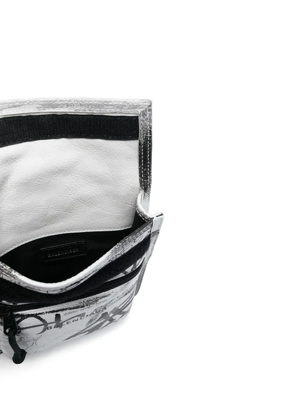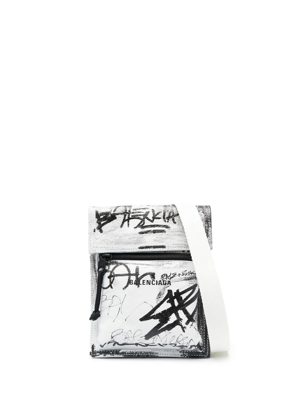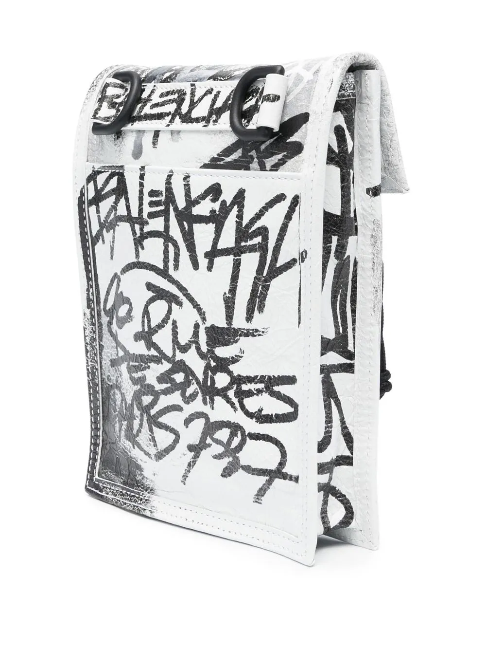 Blanco roto, negro, piel de becerro, estampado Graffiti característico, correa ajustable y removible para el hombro, parte superior plegable, cierre con cremallera en la parte delantera y cierre autoadherente en la parte delantera.