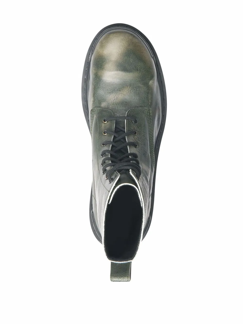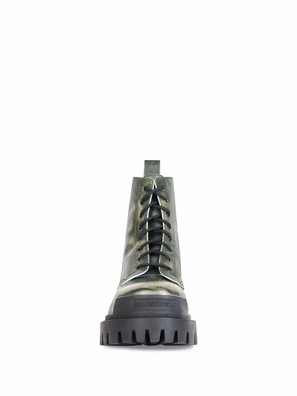 Botines Strike en piel de becerro de color color verde de Balenciaga con puntera redonda, cierre con cordones en la parte delantera, lengüeta en la parte posterior, efecto envejecido y suela dentada de goma.