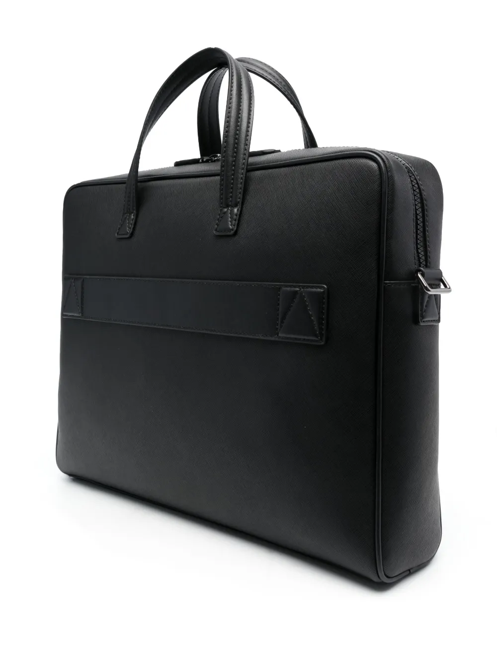 Negro, piel de becerro, acabado texturizado, estampado del logo en la parte delantera, detalle de rayas, llavero adjunto, dos asas en la parte superior, correa ajustable y removible para el hombro, cierre con cremallera en el tope, compartimento principal y bolsillo con cremallera en la parte delantera.