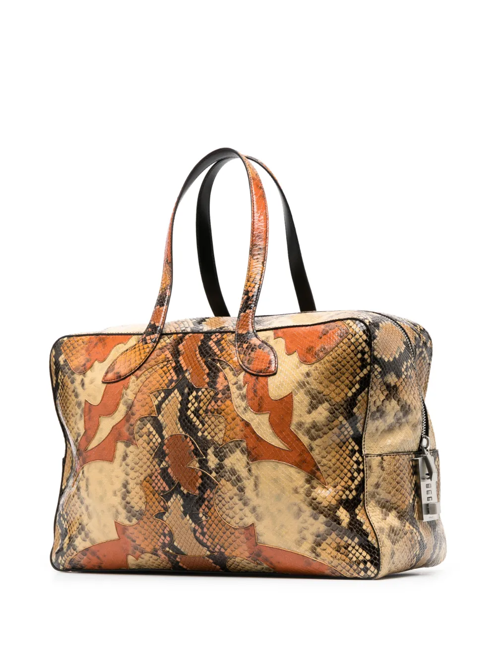 Marrón, negro, beige, piel de becerro, estampado de piel de serpiente, acabado en tono plateado, cierre con cremallera en el tope, cierre con código, dos asas en la parte superior y compartimento principal.