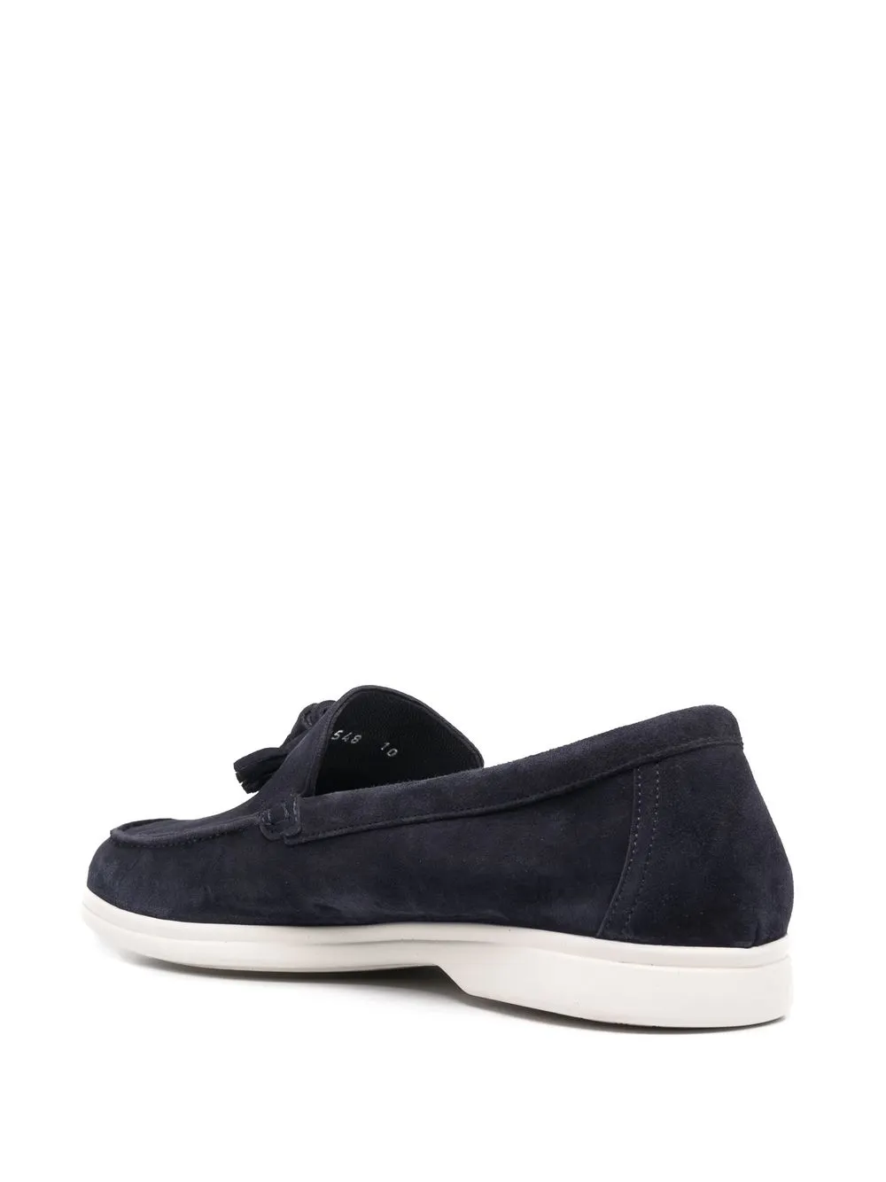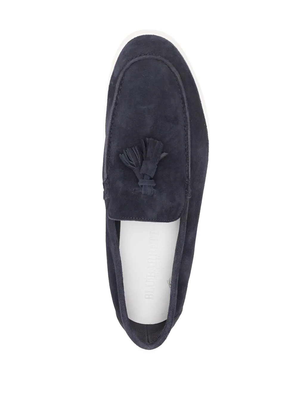 Azul marino, ante, detalle de borla grande, puntera de almendra, estilo slip-on, plantilla con logo y suela plana de goma.