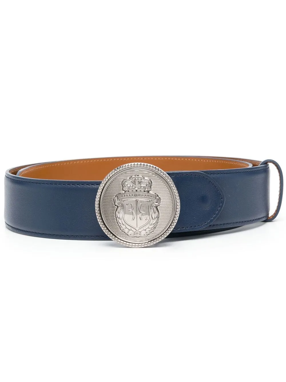 Azul marino, piel de becerro, cierre con hebilla del logo, acabado en tono plateado, diseño ajustable, detalle de agujeros y extremo en punta.