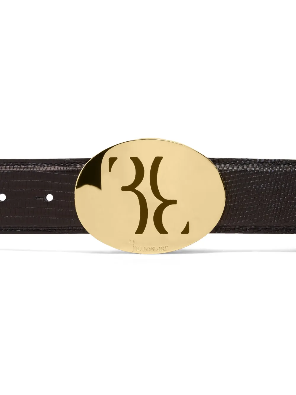 Negro, efecto de piel de lagarto, placa del logo, detalle de agujeros y cierre con botones de presión.