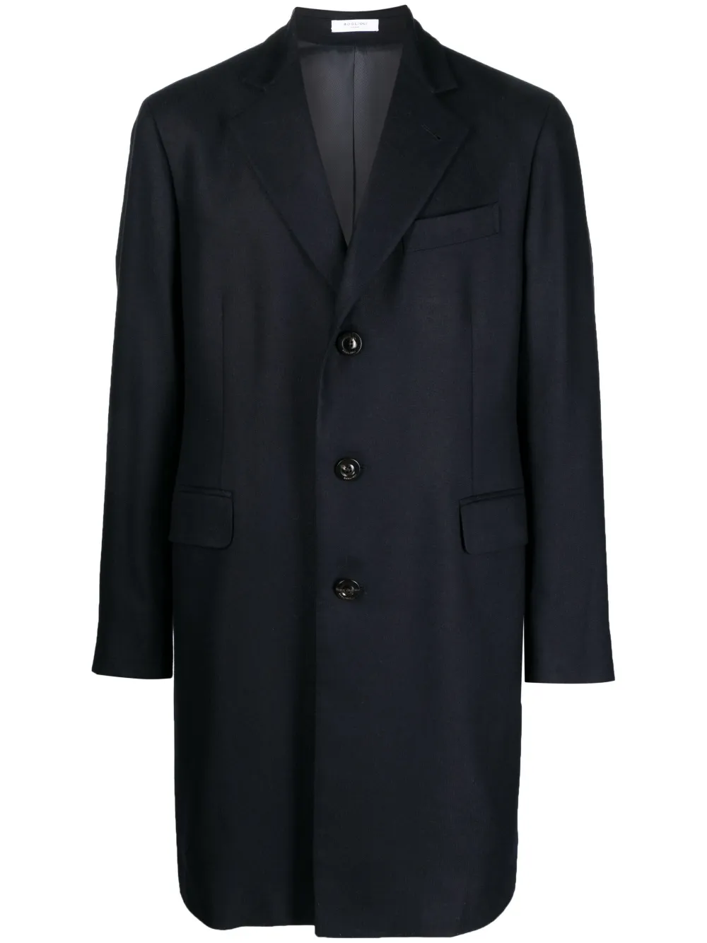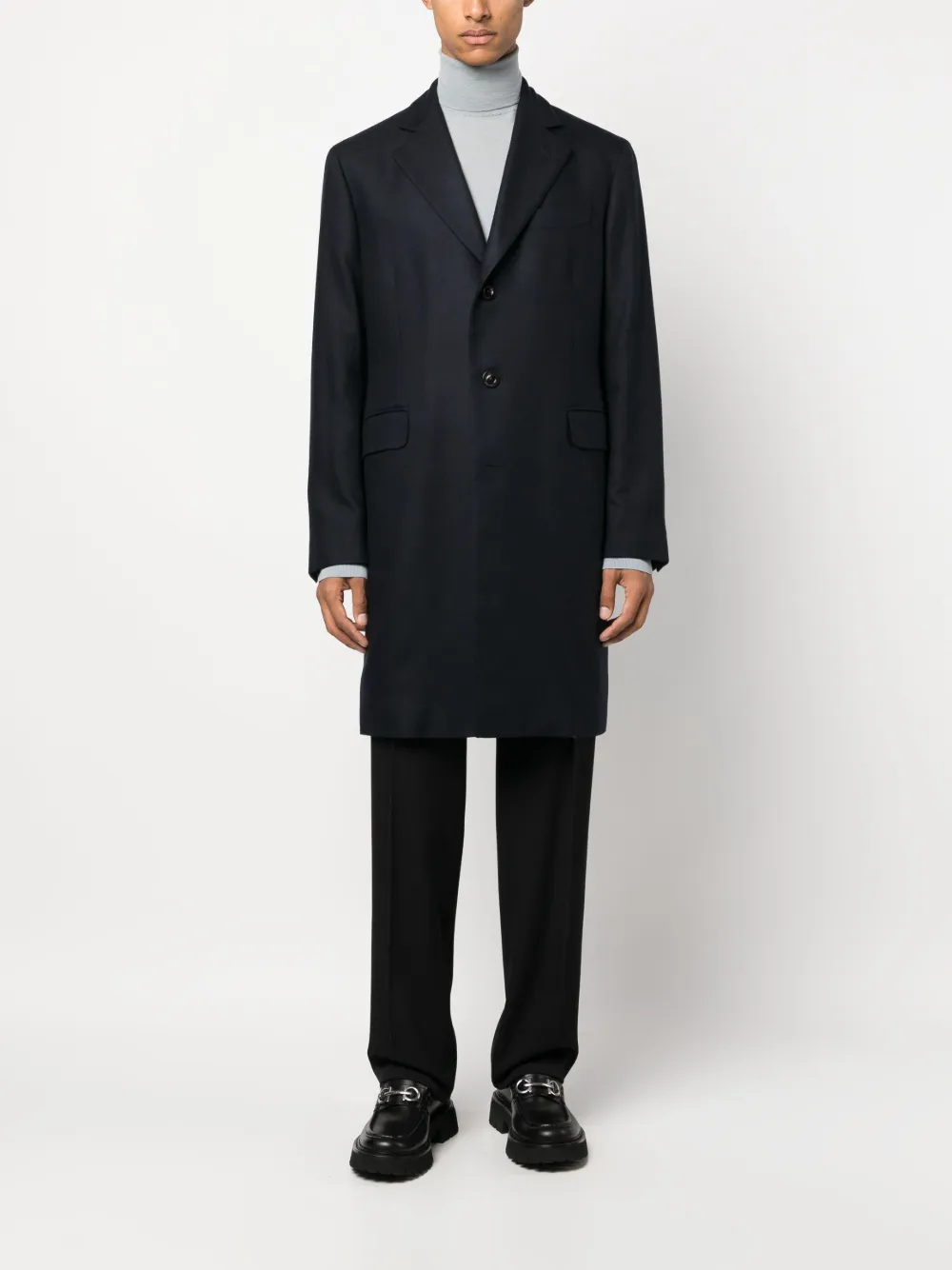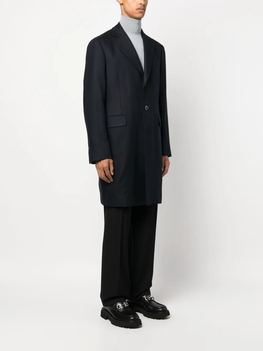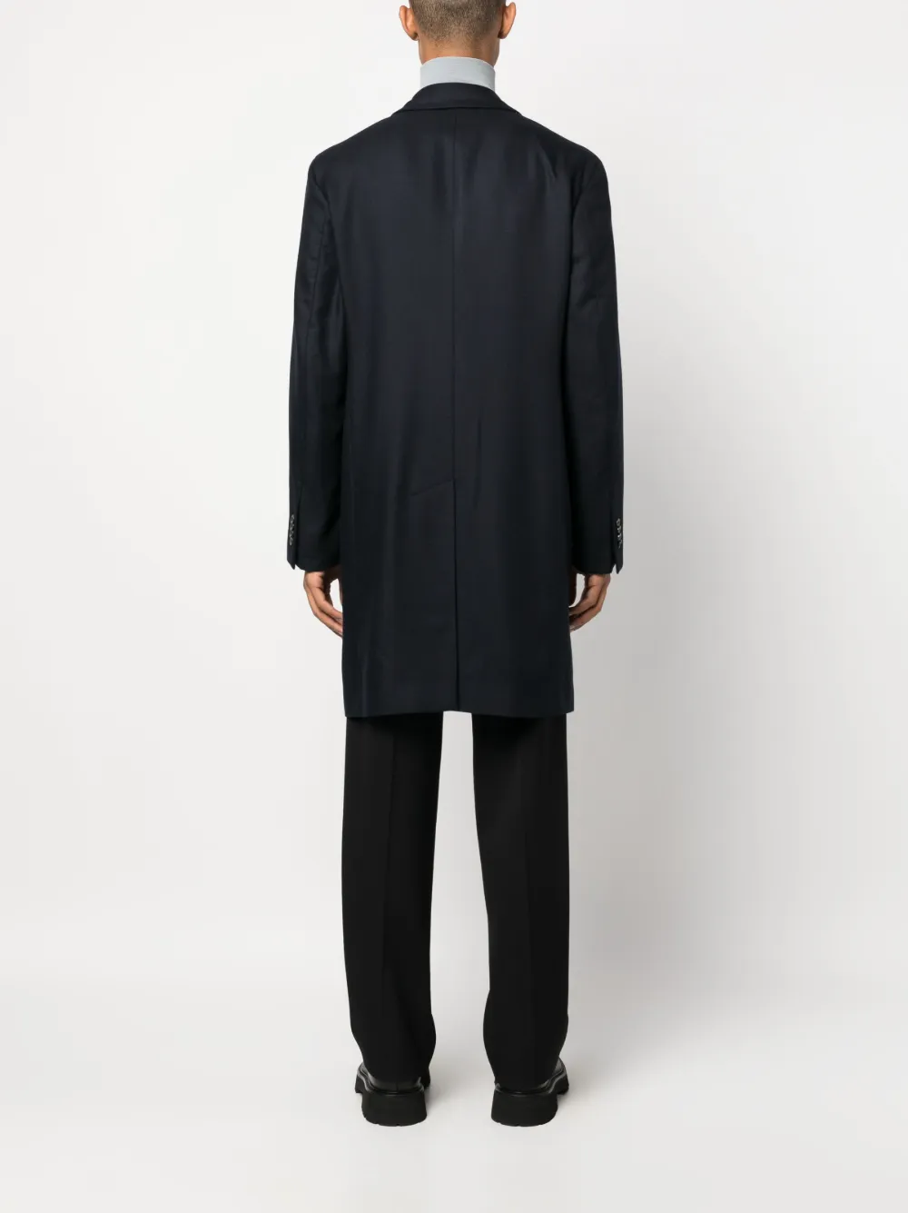 Azul marino, cachemira, solapas de pico, cierre con botones en la parte delantera, bolsillo con ribete en el pecho, dos bolsillos con solapa en la parte delantera, manga larga, puños con botón, abertura en la parte posterior de diseño americano, dobladillo recto y largura media.
