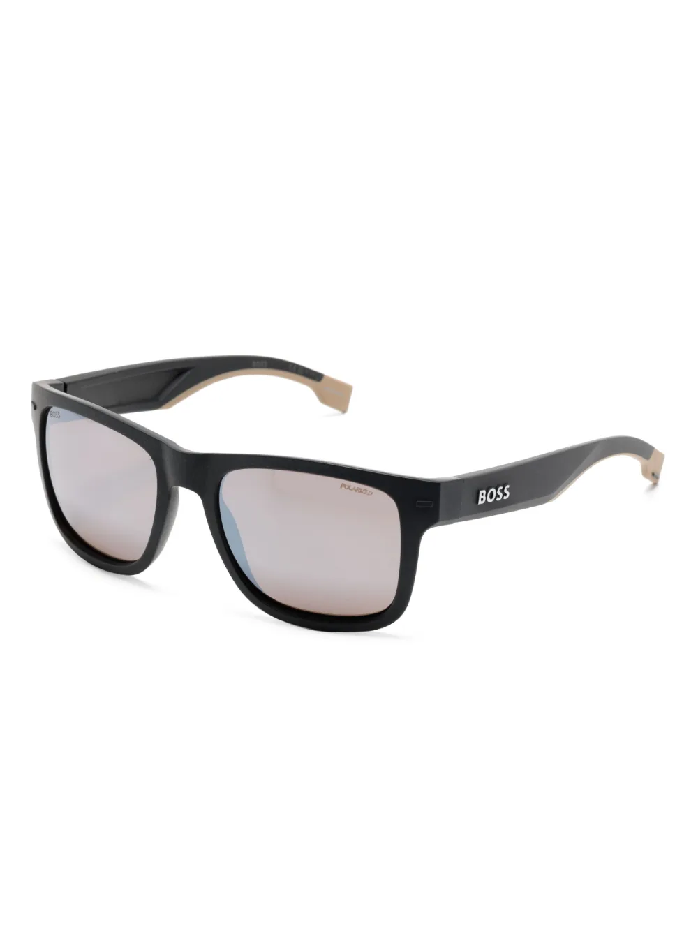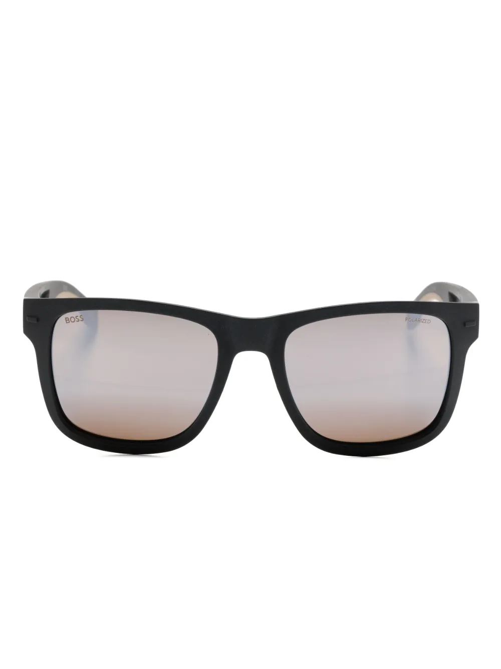 square-frame sunglasses from BOSS featuring black, matte effect, logo-embossed arm, square frame, brown tinted lenses, straight arms and curved tips. These glasses come with a protective case..
