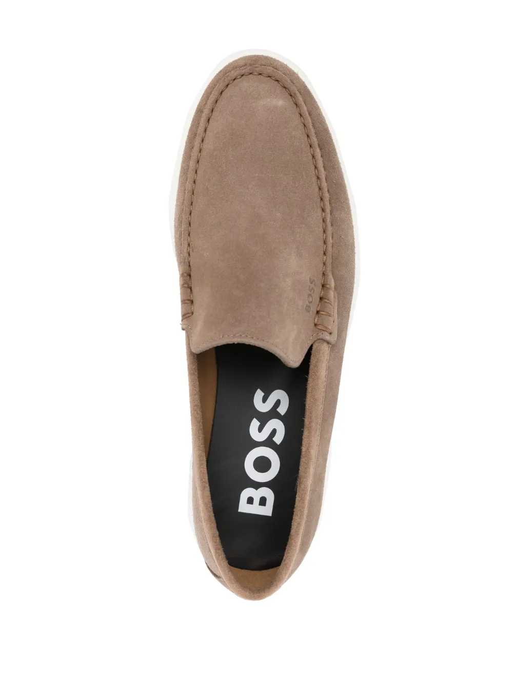 Beige almendra, piel de becerro, puntera redonda, costuras del mismo tono, plantilla con logo, estilo slip-on y suela plana de goma.