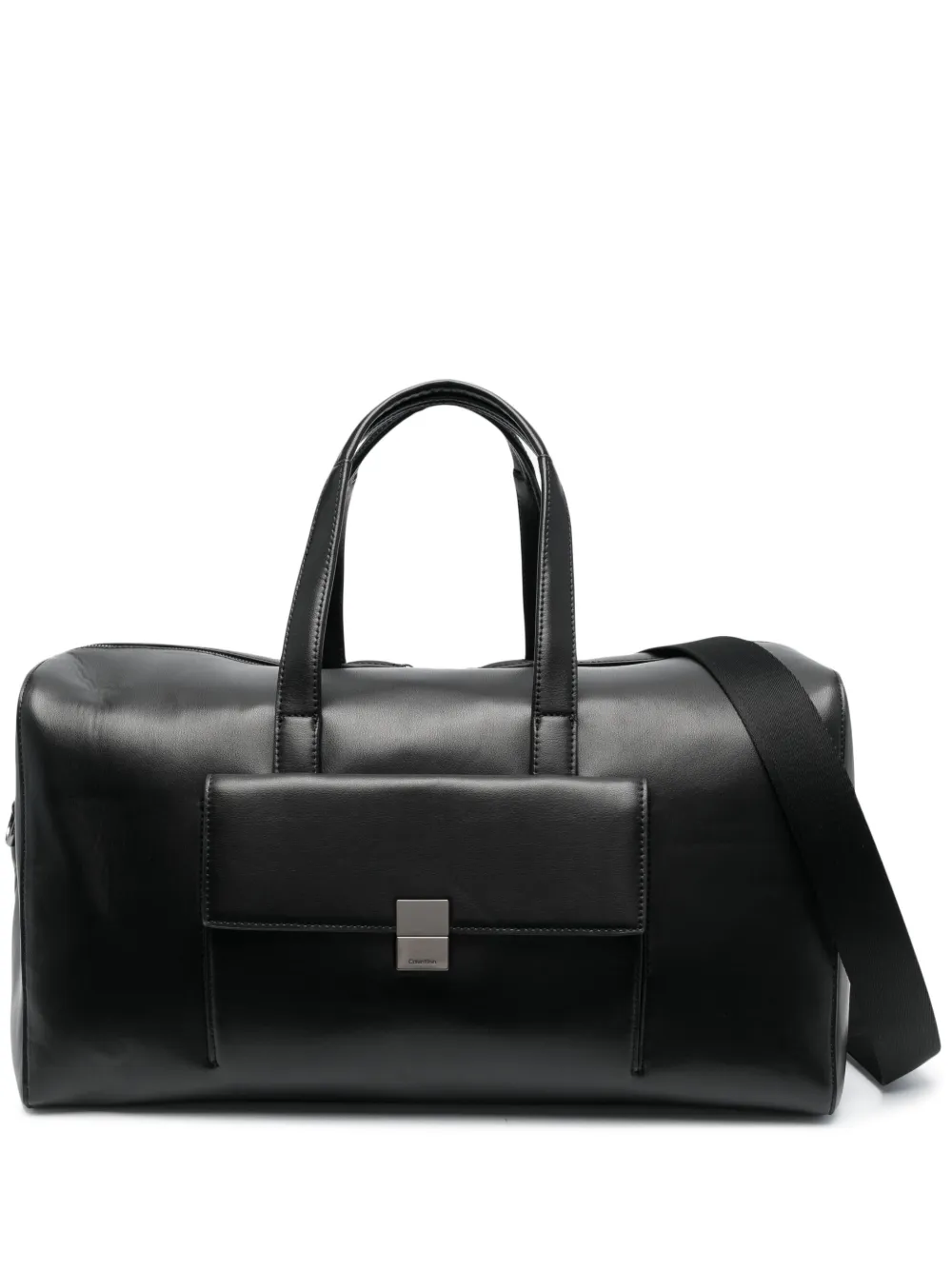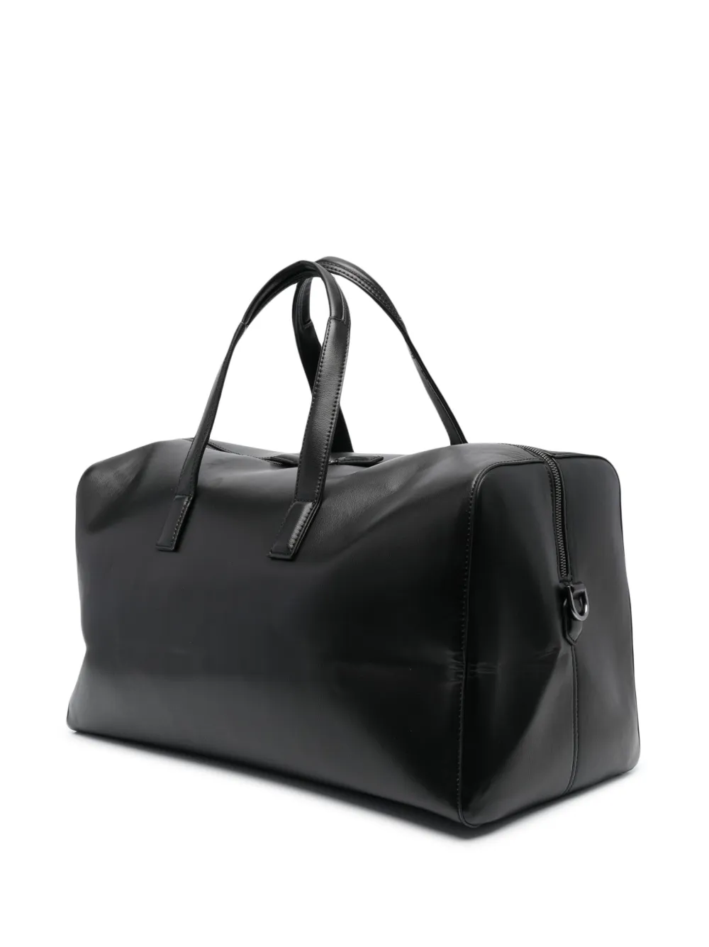 Negro, piel de becerro, bolsillo con solapa en la parte delantera, placa del logo, dos asas largas en la parte superior, cierre con cremallera en el tope, forma rectangular, compartimento principal, correa ajustable y removible para el hombro y parche del logo en el interior.