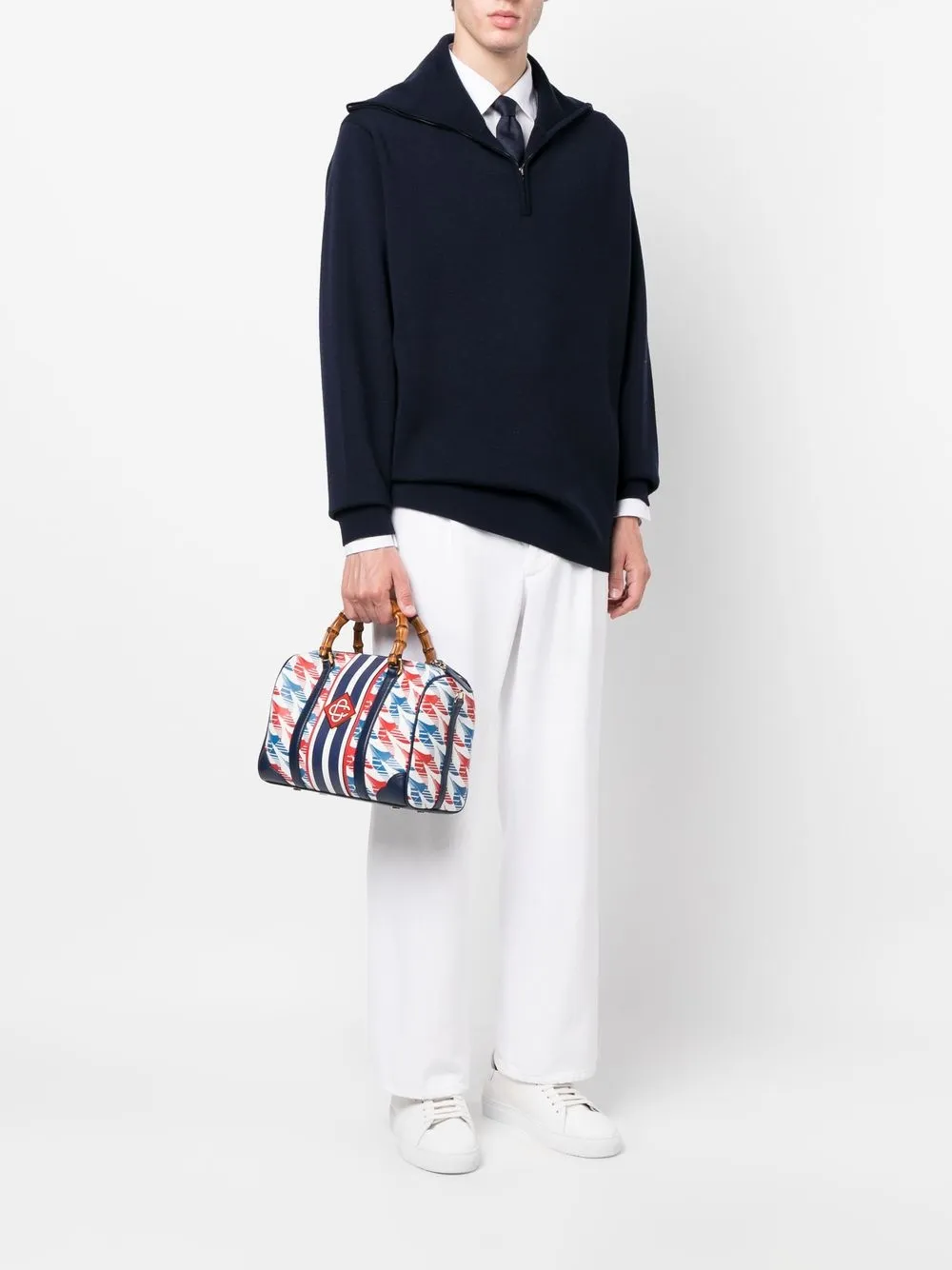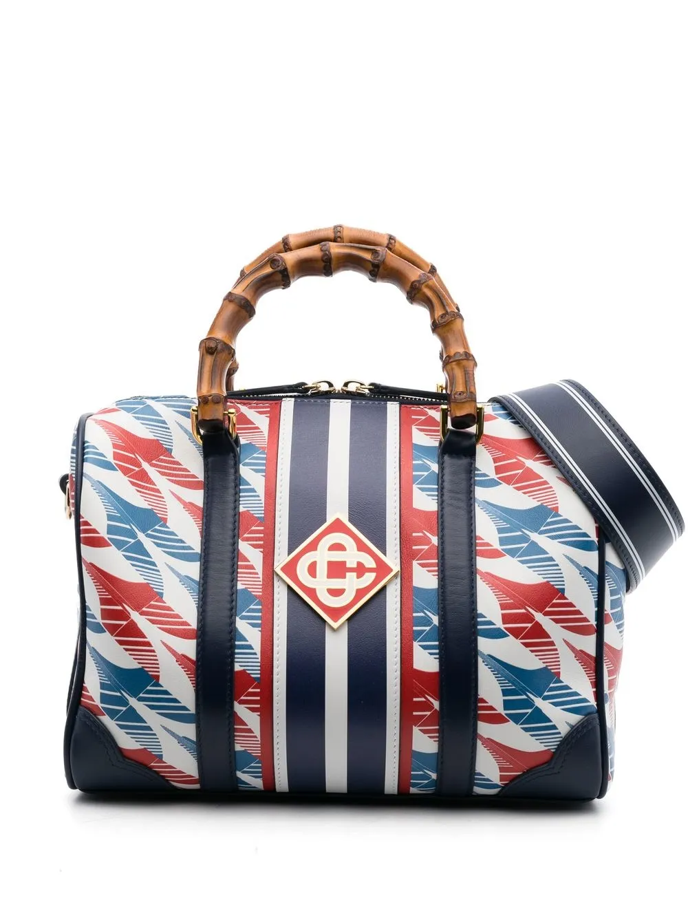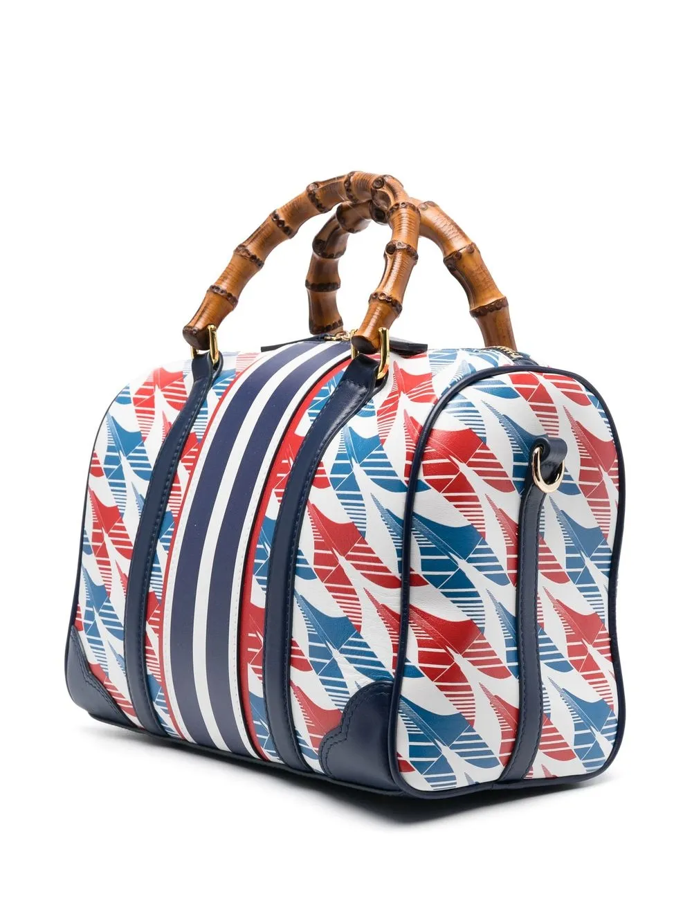 Rojo, blanco y azul, piel de becerro, estampado gráfico en toda la pieza, placa del logo, cierre con cremallera en el tope, correa ajustable y removible para el hombro, asas superiores de bambú características y compartimento principal.