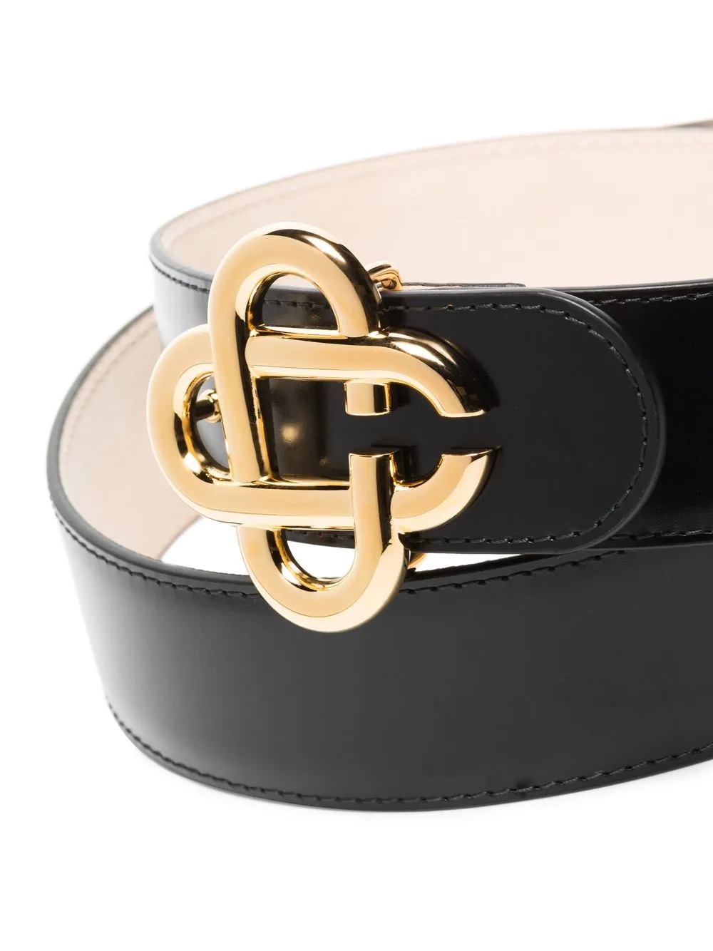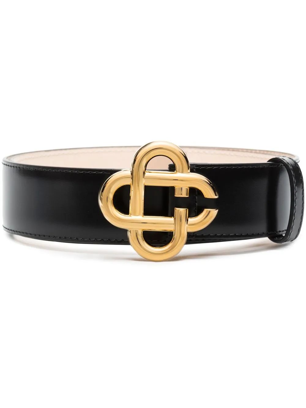 Negro, piel de becerro, hebilla con logo, acabado en tono dorado, agujeros perforados y diseño ajustable.