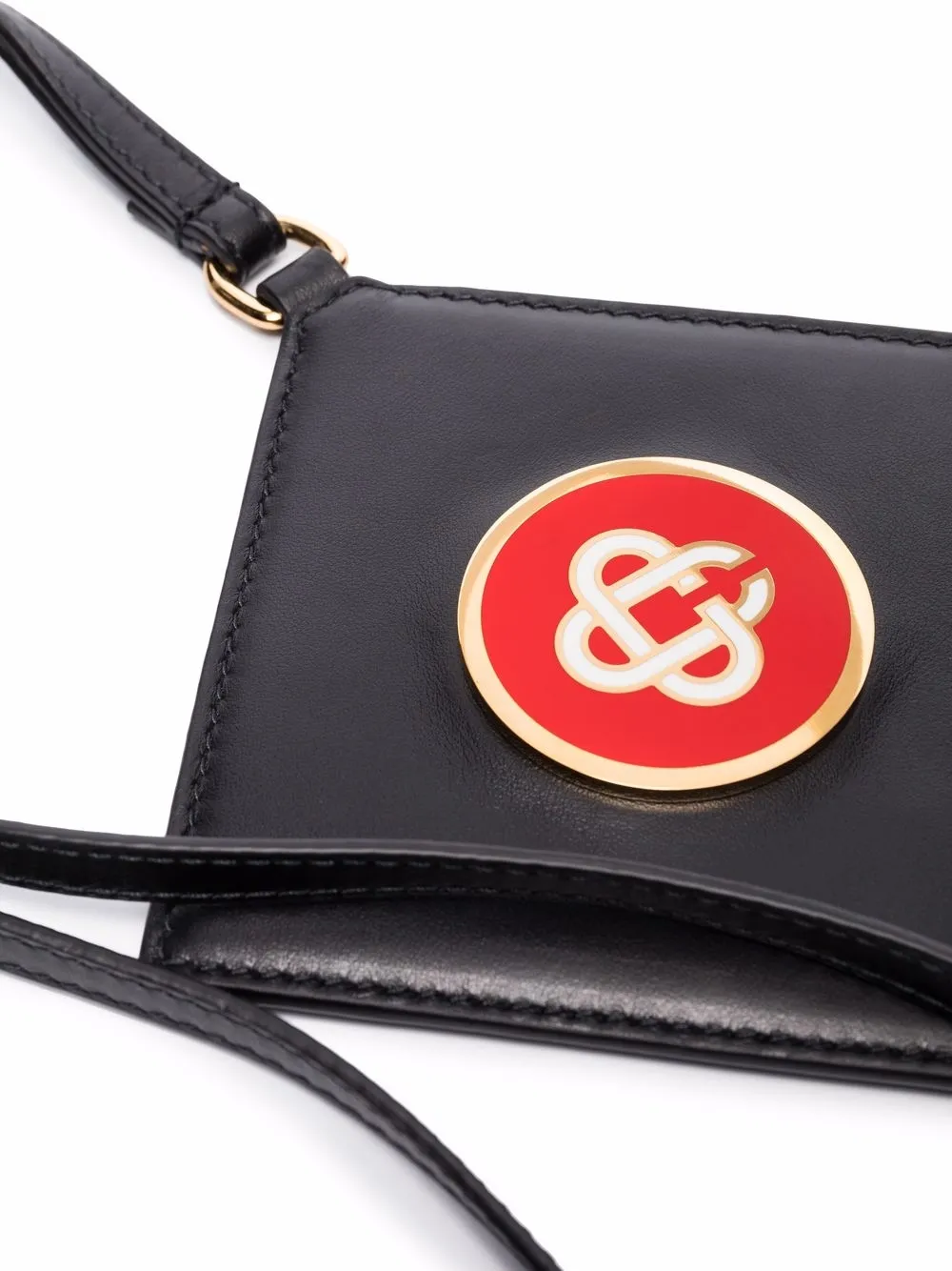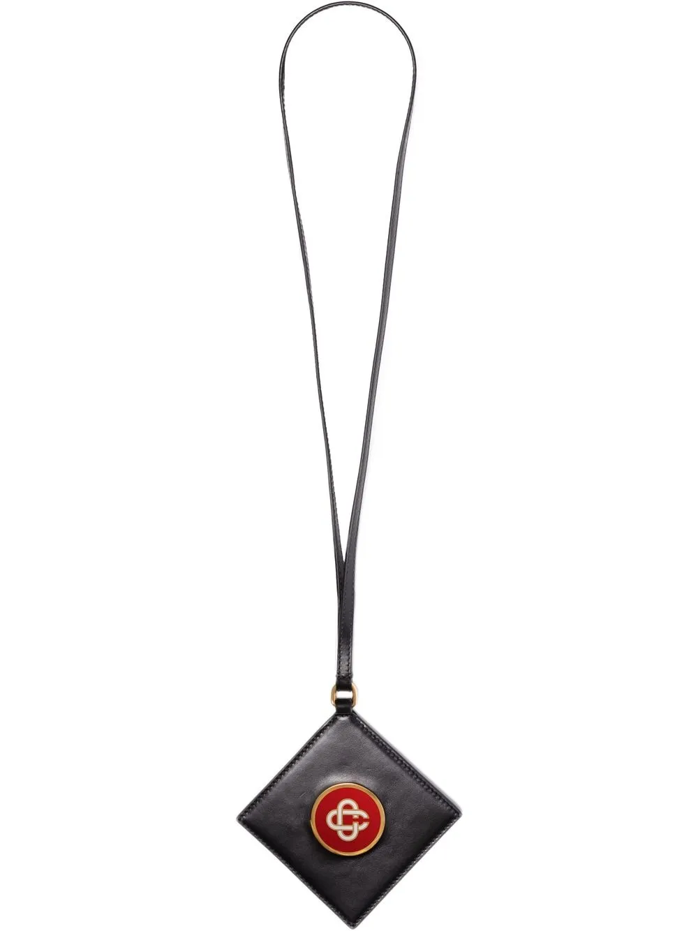 Acabado mate, estampado del logo en la parte delantera, compartimentos para tarjetas y correa ajustable para el cuello. Material: cuero.