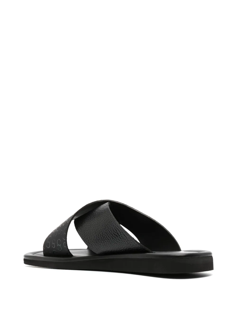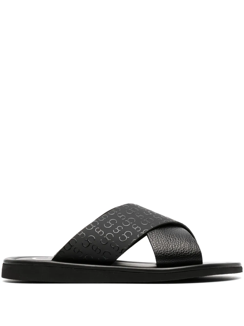 Negro carbón, piel de becerro, textura granulada, motivo del monograma en relieve, tira para el dedo, plantilla de piel con logo, puntera redonda, estilo slip-on y suela plana de goma.