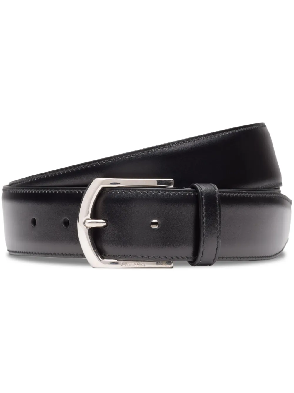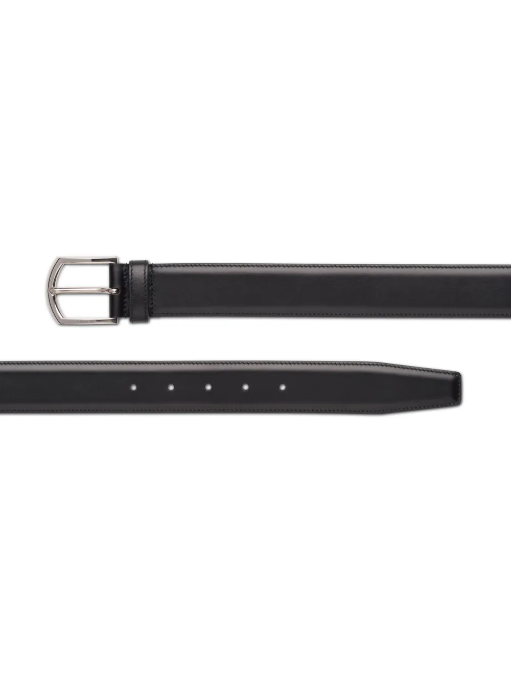 Negro, piel de becerro, acabado en tono plateado, acabado pulido, cierre con hebilla en D, agujeros perforados y diseño ajustable.