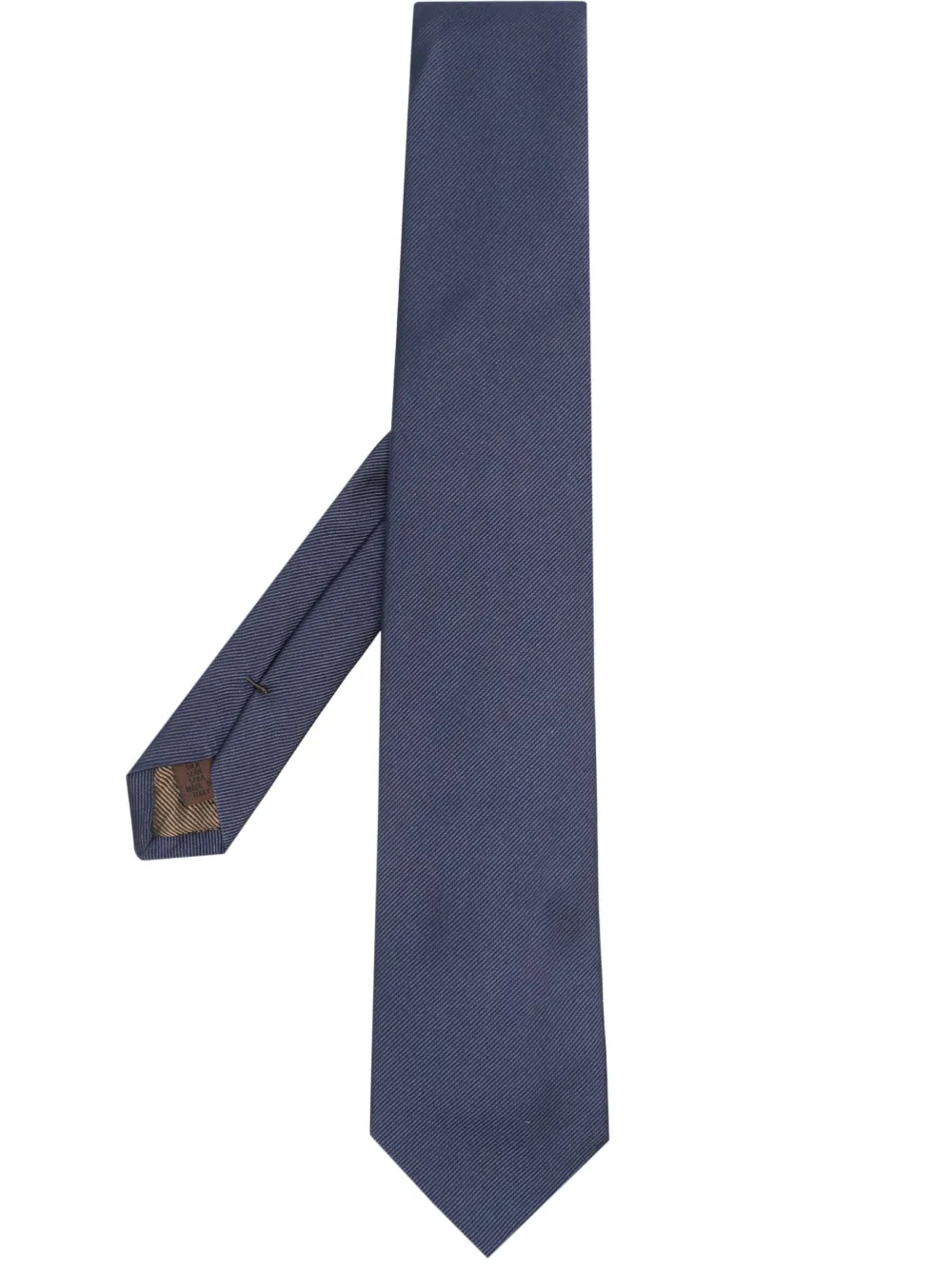 Azul marino, seda, acabado texturizado, punta puntiaguda y diseño ajustable.