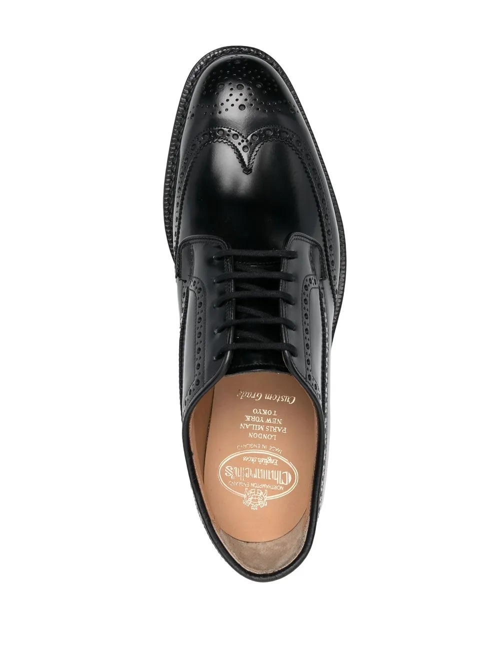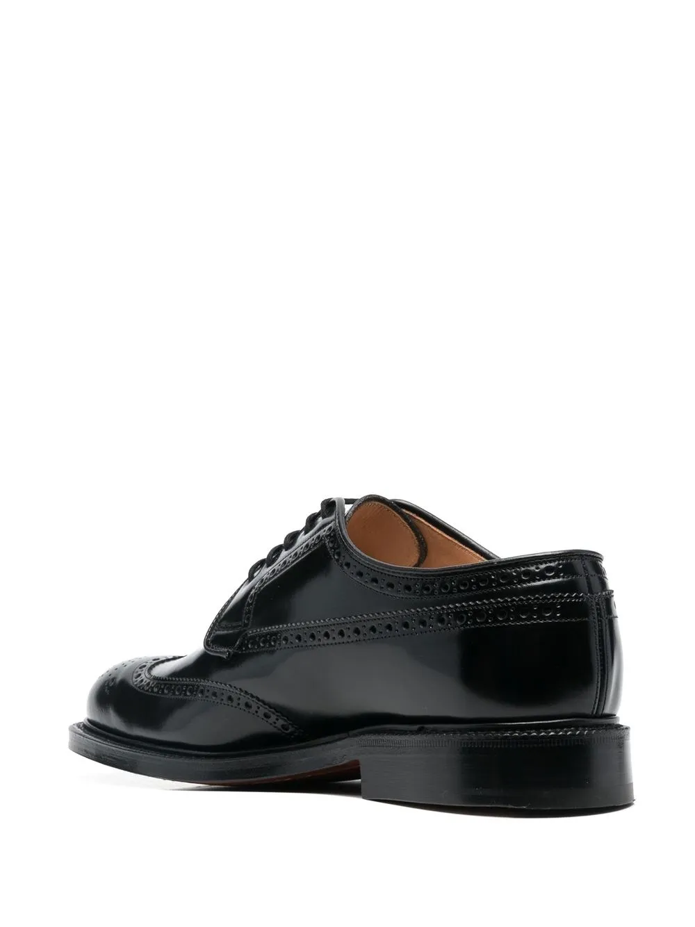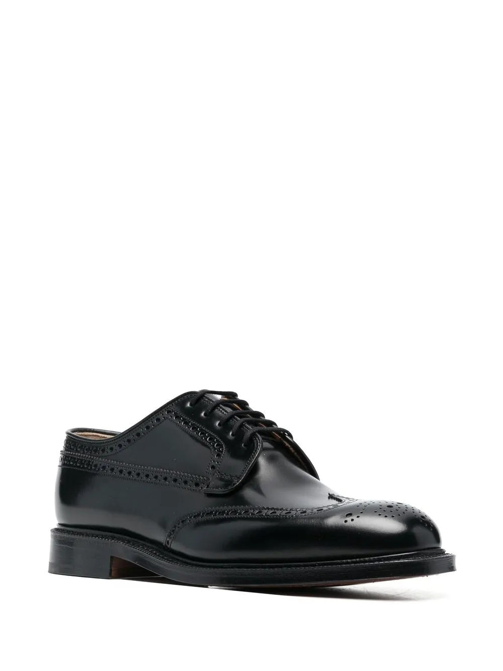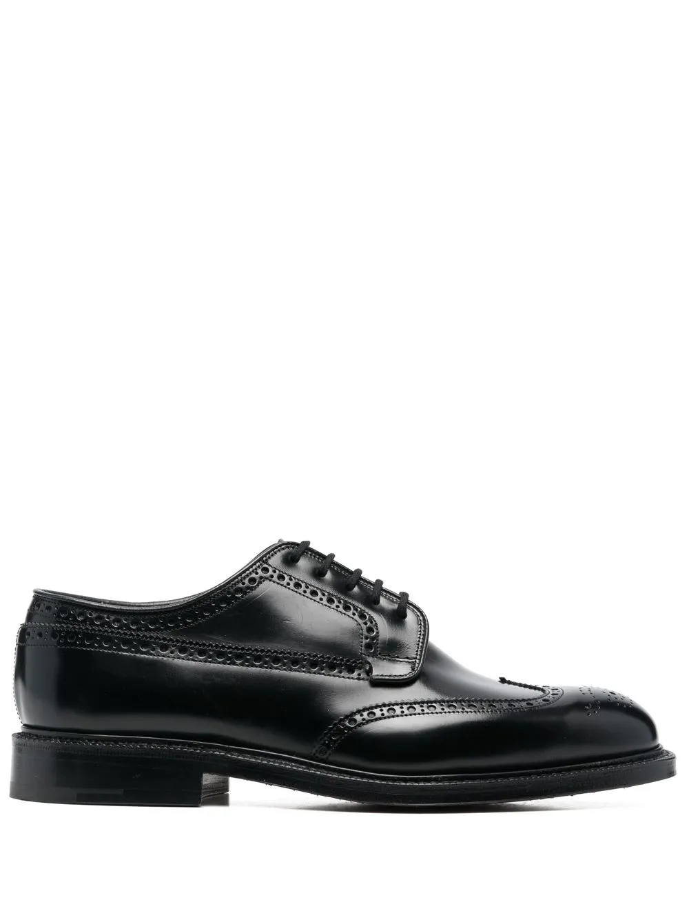 Negro, piel de becerro, aplique de perforaciones, plantilla de piel con logo, puntera de almendra, cierre con cordones en la parte delantera y tacón bajo.