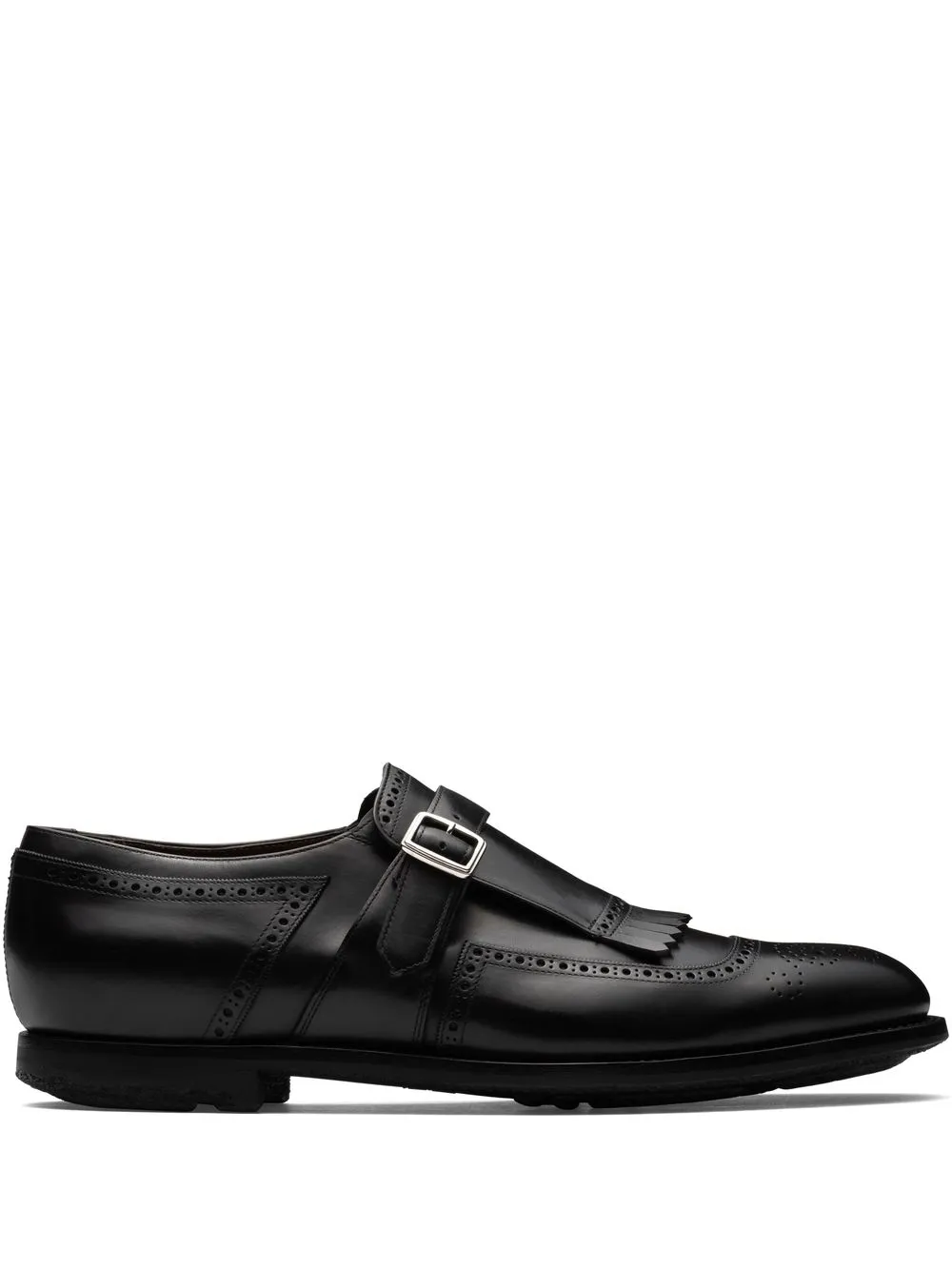 Negro, piel de becerro, detalle de agujeros, detalle de flecos en la puntera, cierre con hebilla, puntera de almendra y suela gruesa.