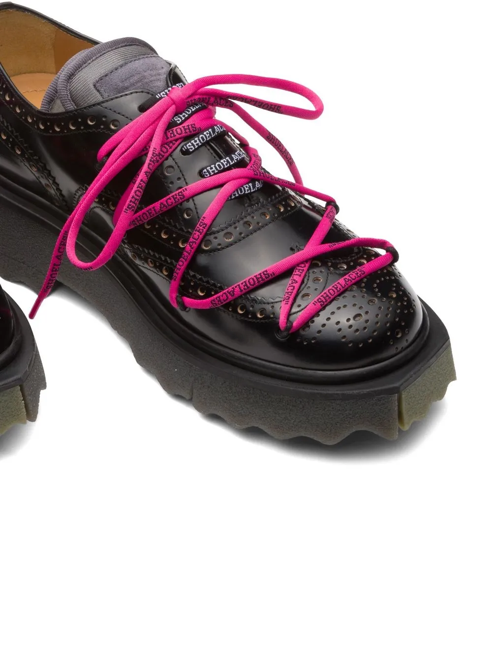 Negro, piel de becerro, detalle de agujeros, etiqueta con logo Zip Tie, cierre con cordones en la parte delantera, plantilla anatómica, detalle de ojales, suela plana de goma y cordones en contraste.