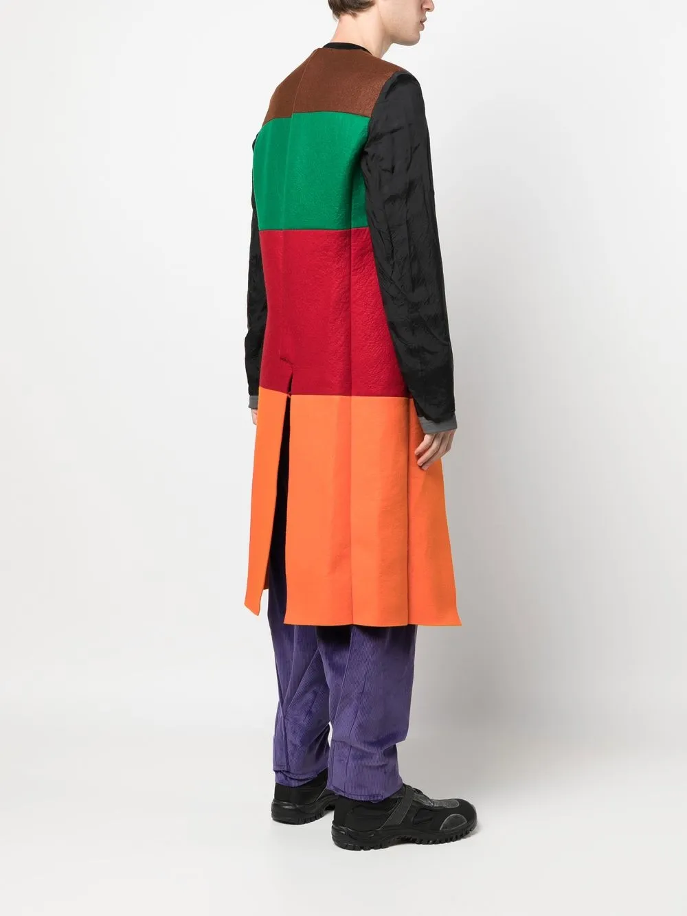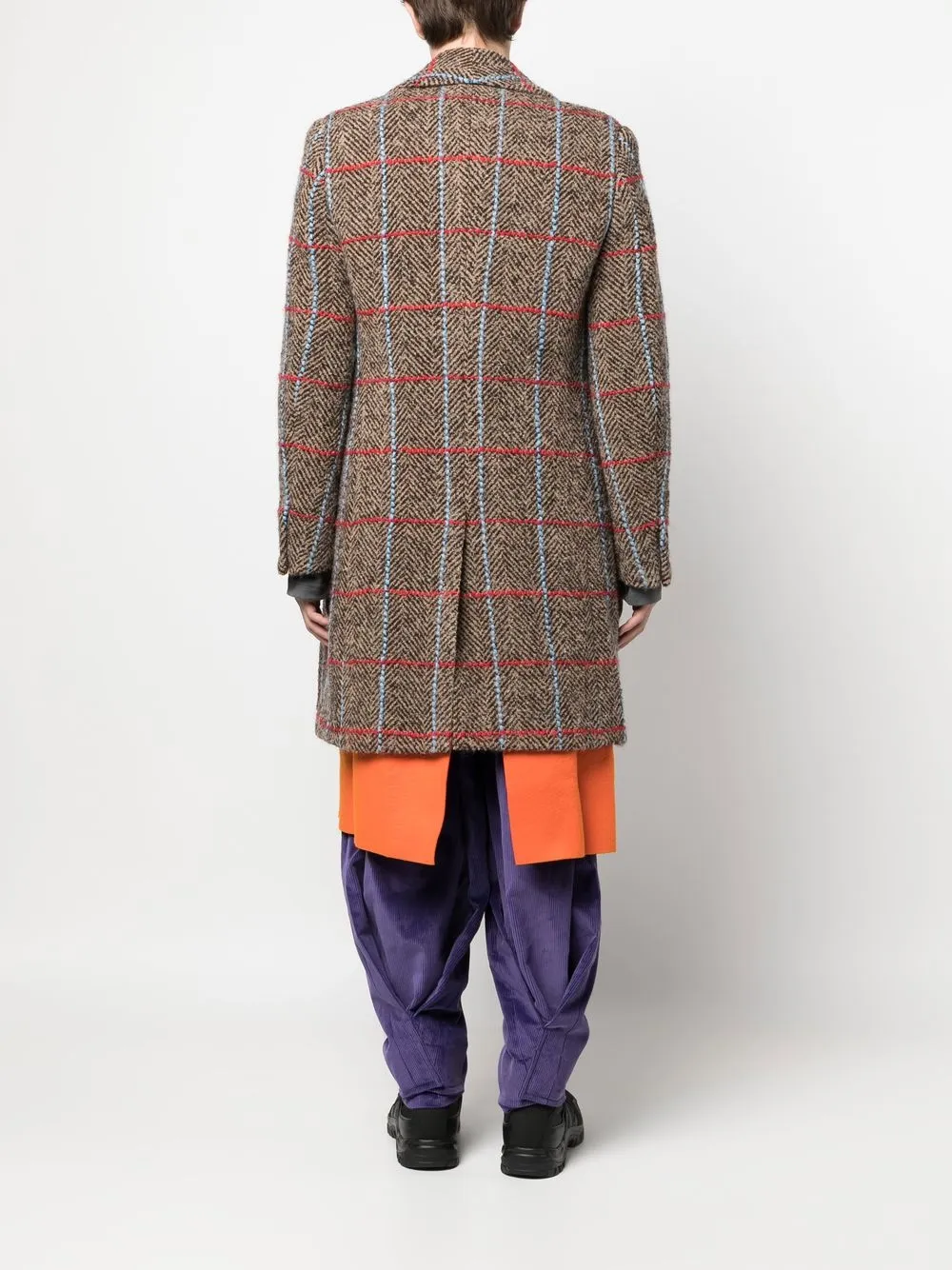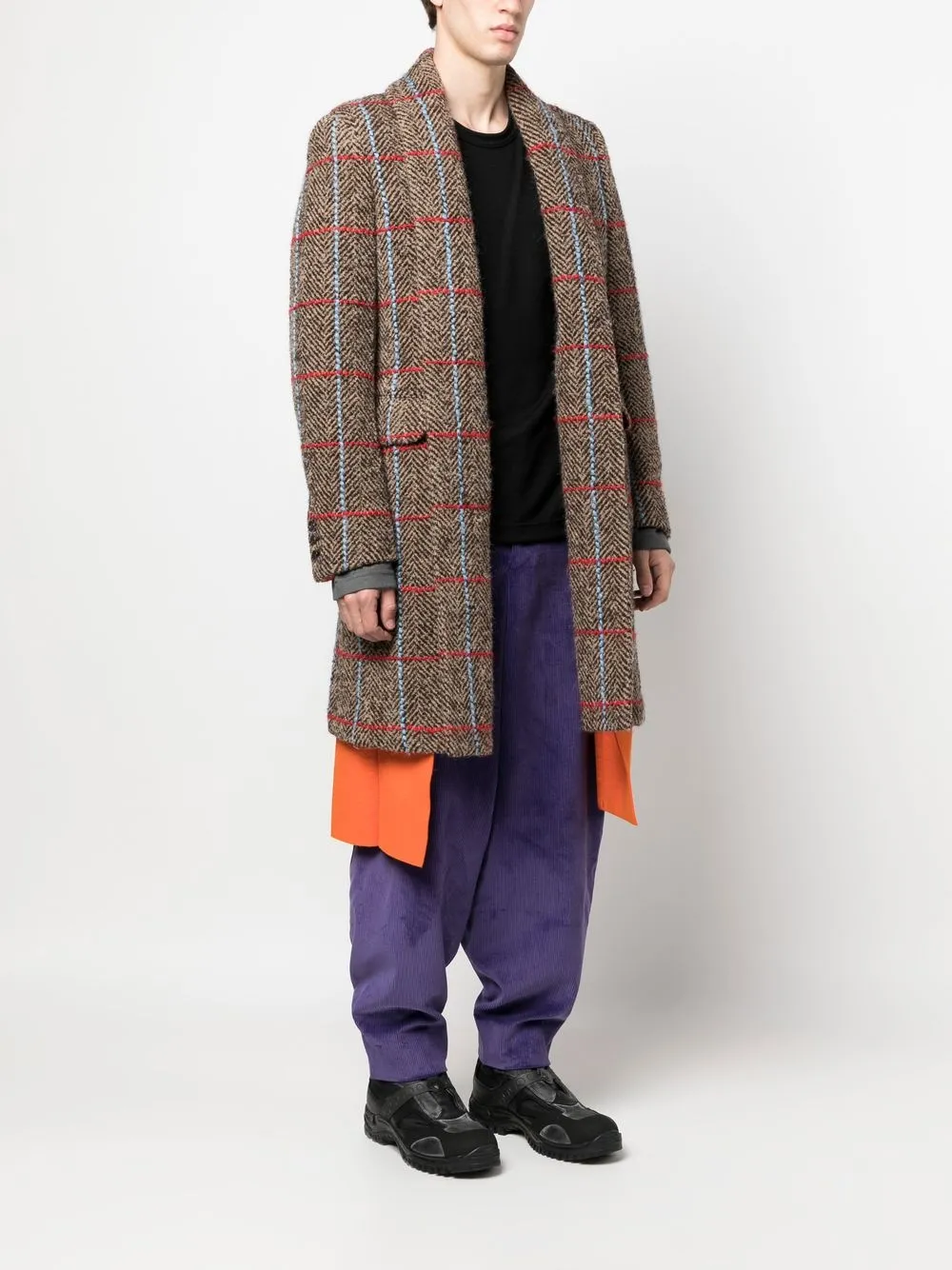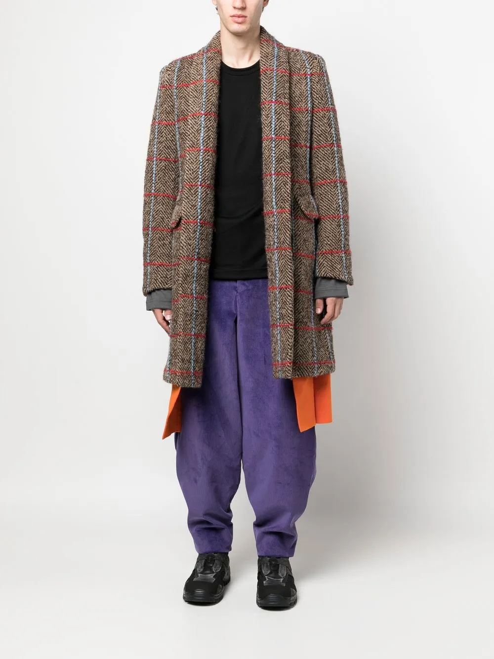 Marrón claro, multicolor, diseño en tweed, estampado de espiga, detalles a capas, solapas redondas, manga larga, dos bolsillos laterales con solapa, diseño largo y reversible.