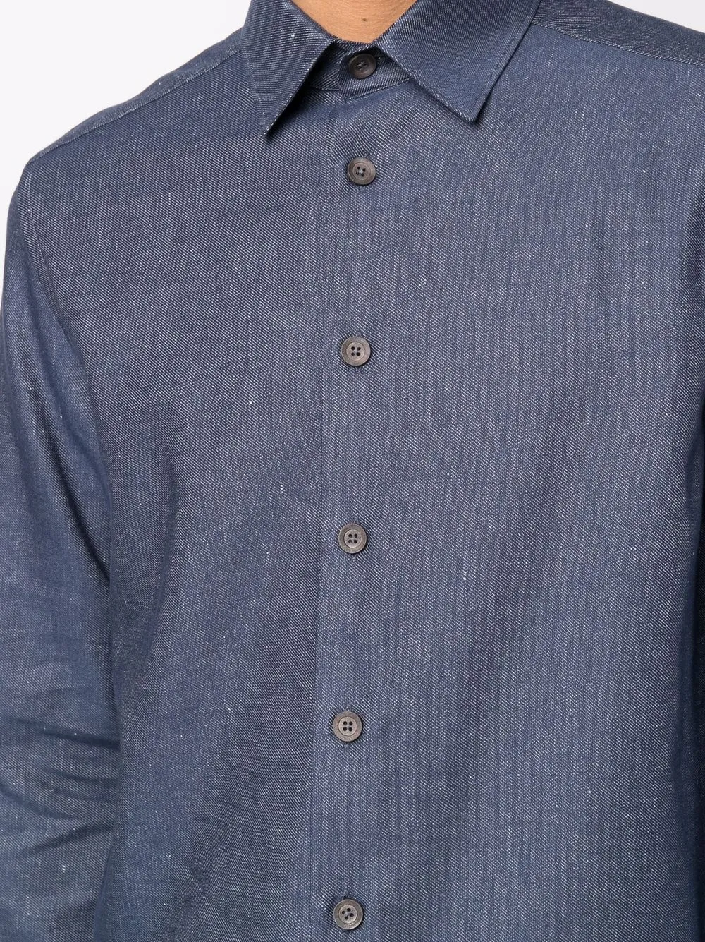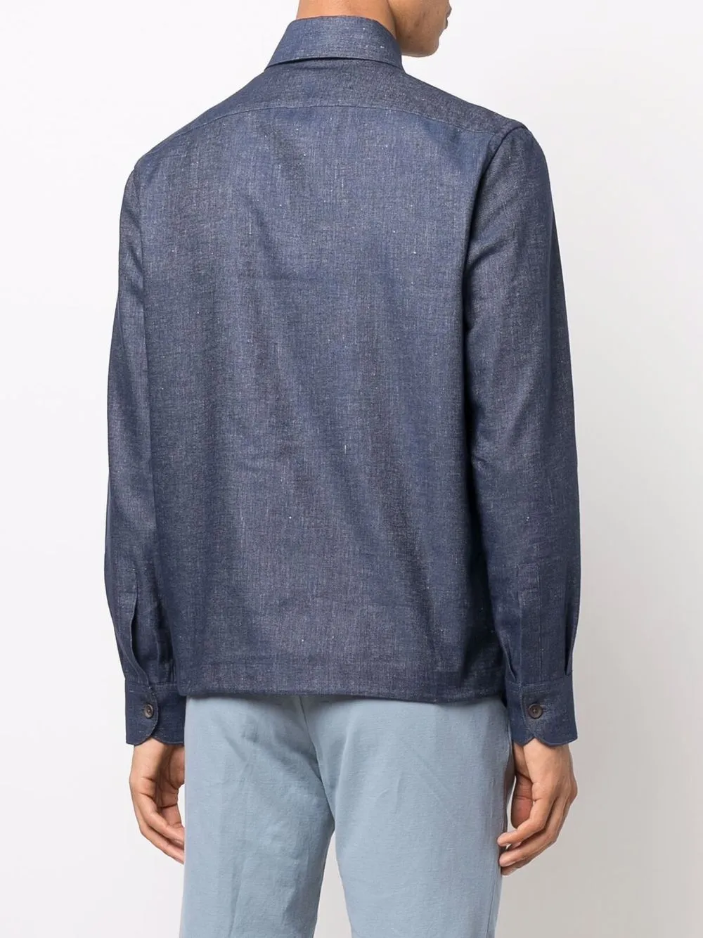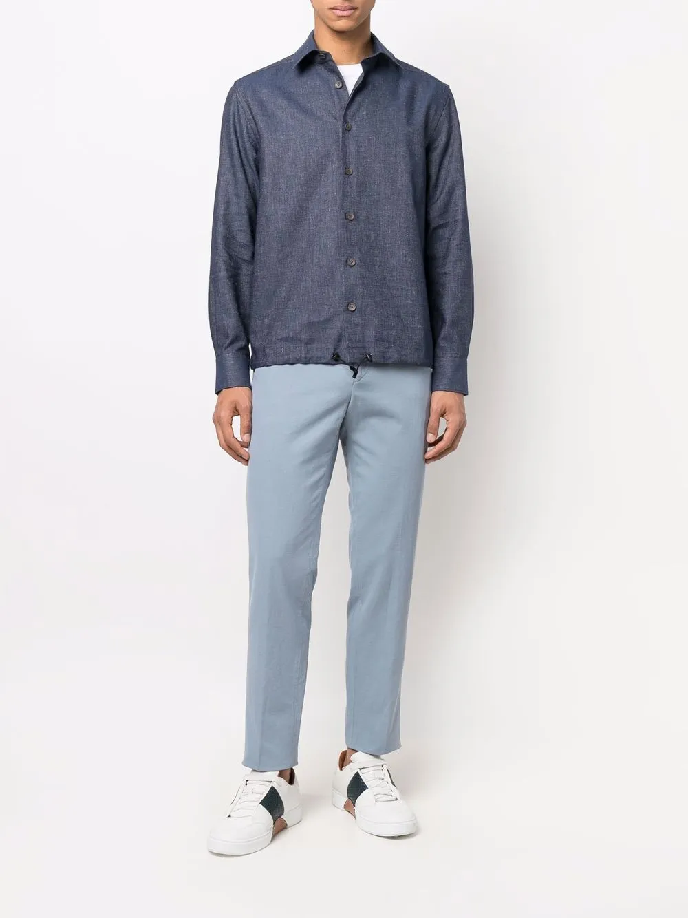 Cuello clásico, cierre con botones en la parte delantera, puños con botón y dobladillo con cordón.