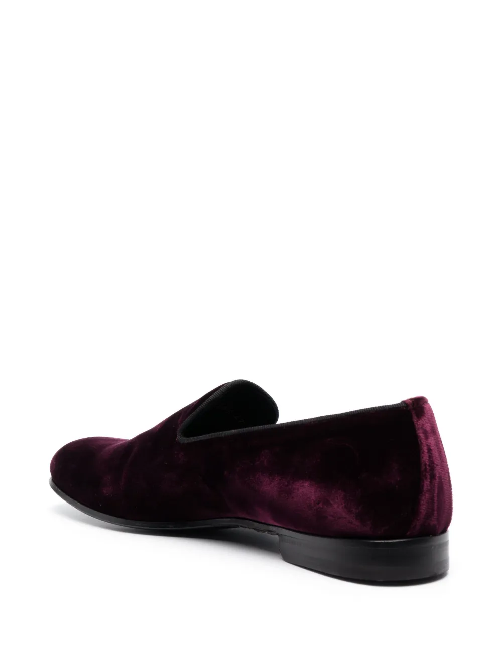 Rojo vino, piel de becerro, terciopelo, ribete de cinta grosgrain, plantilla de piel con logo, puntera de almendra, estilo slip-on