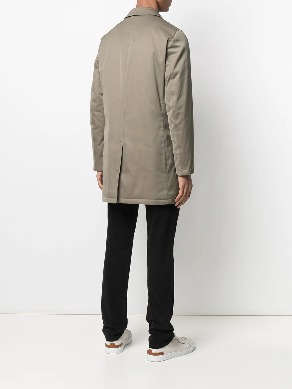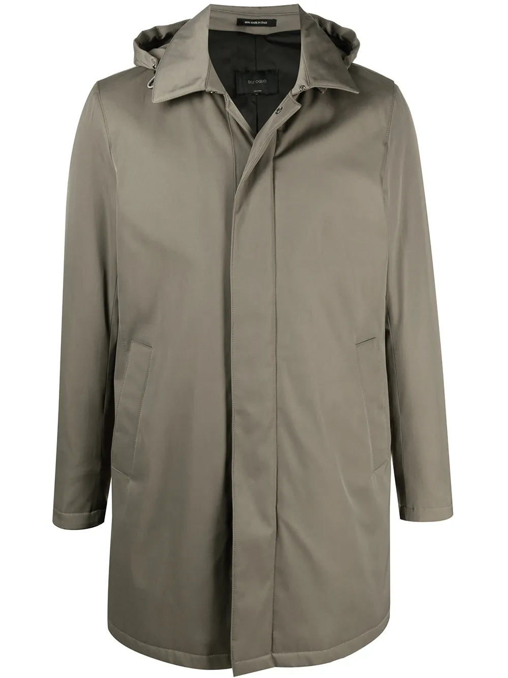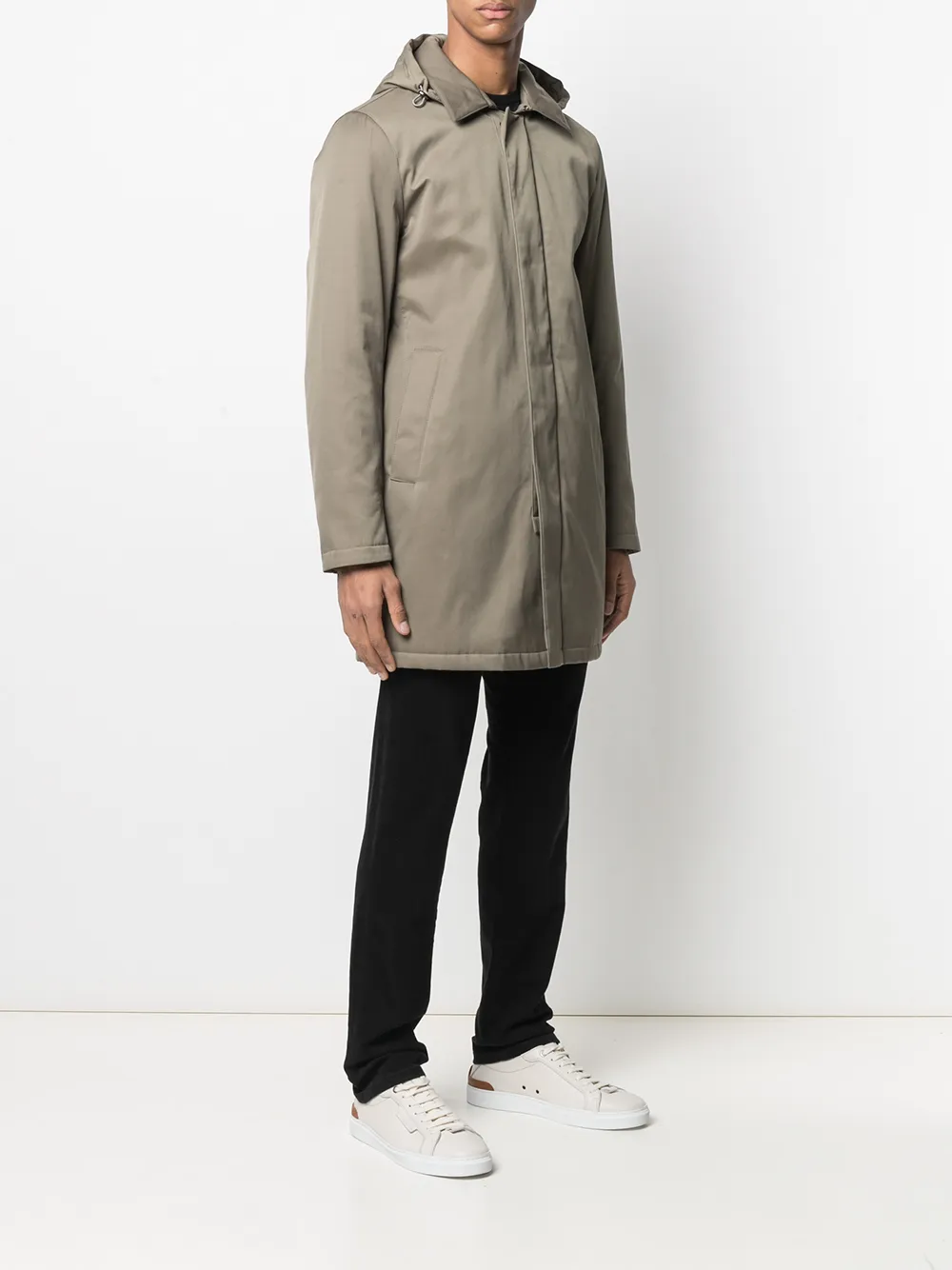 Diseño con capucha, cierre con botón y cremallera en la parte delantera, manga larga, dos bolsillos laterales, abertura central en la parte posterior y largura media. Material: mezcla de algodón.