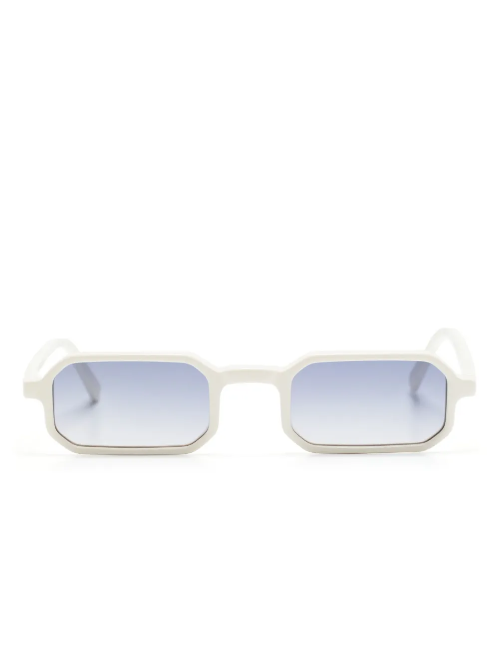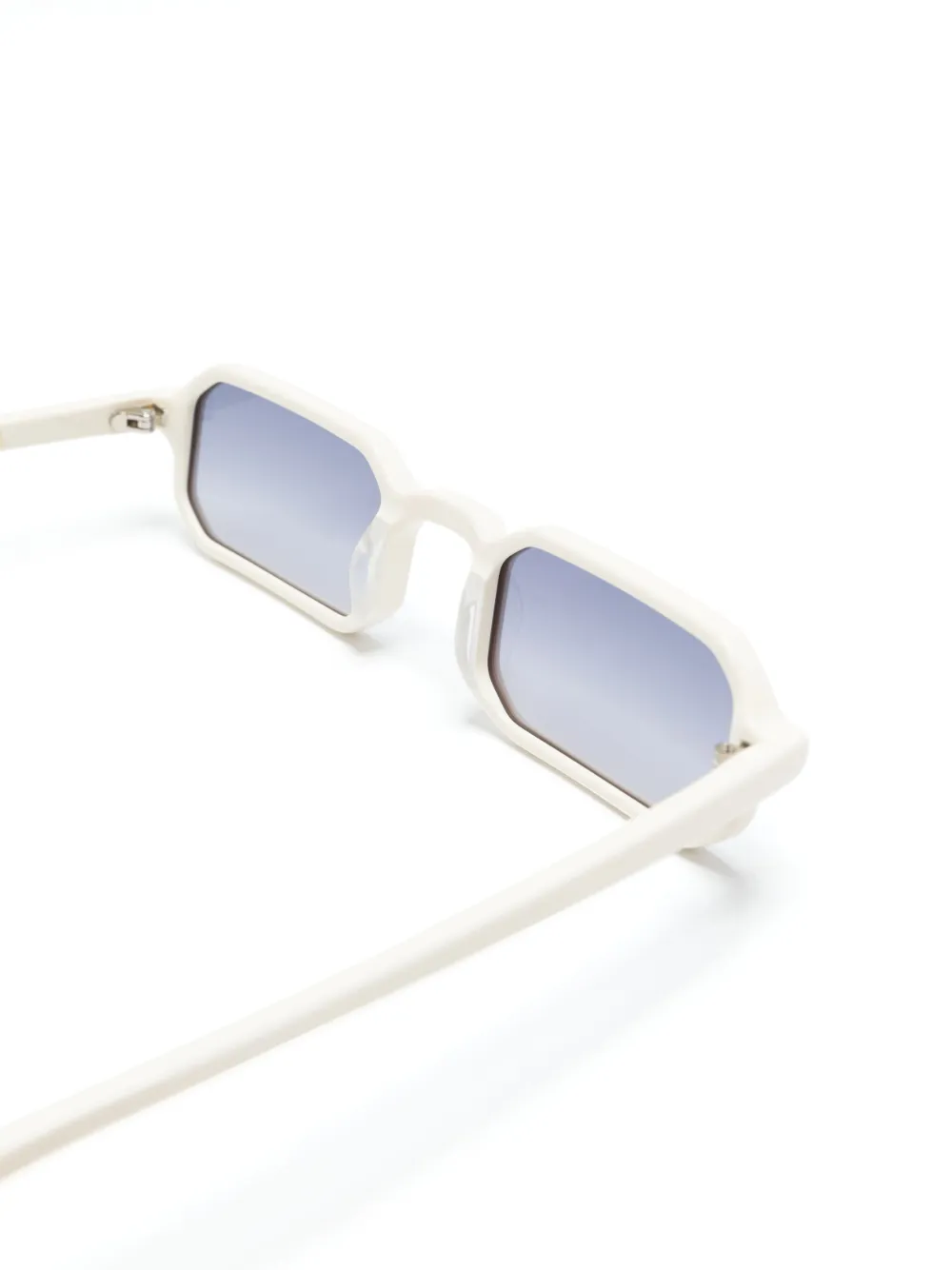 Blanco, acetato, montura rectangular, lentes de color azul, patillas rectas y puntas curvadas. Estas gafas vienen con un estuche de protección..