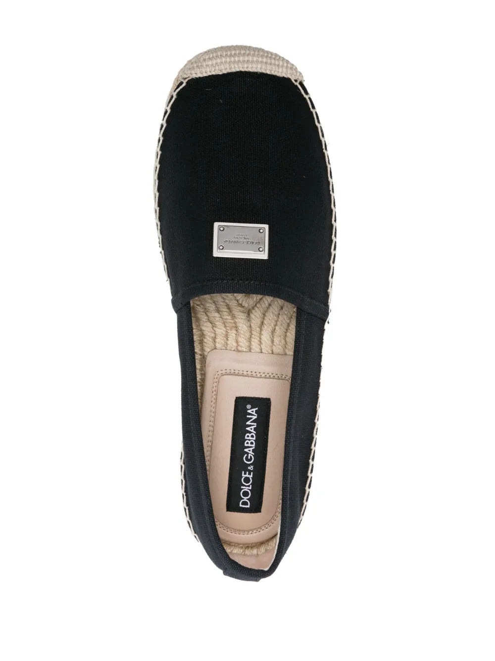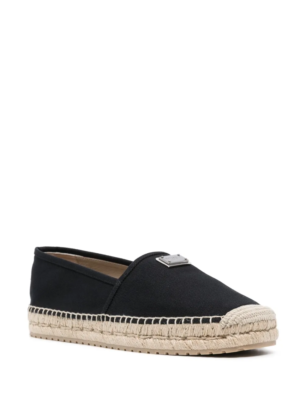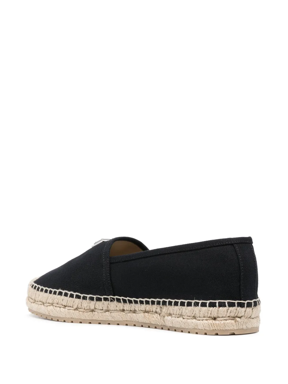 Negro, rafia, placa del logo en tono plateado, plantilla con logo, puntera redonda, suela de rafia trenzada y estilo slip-on.