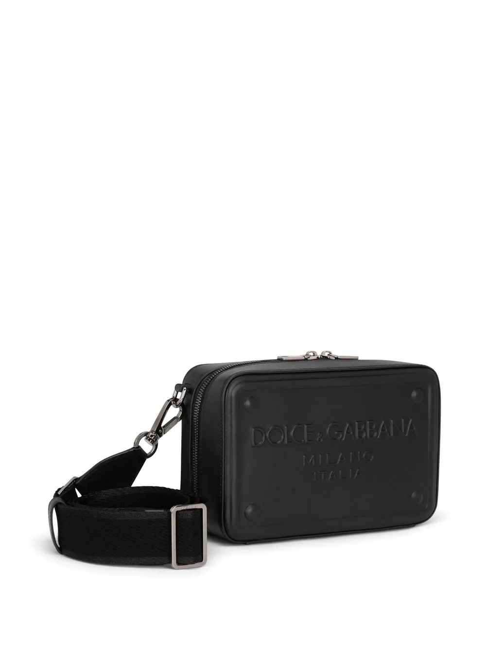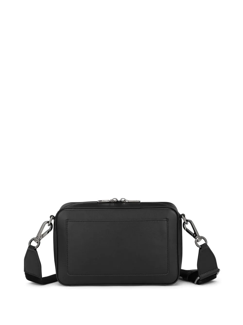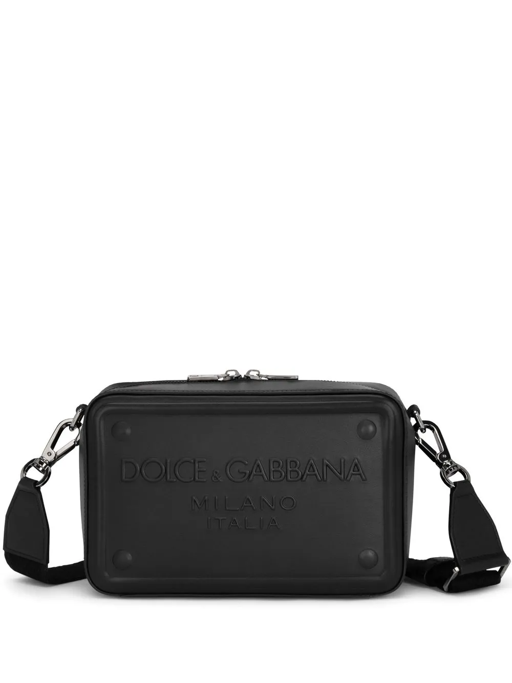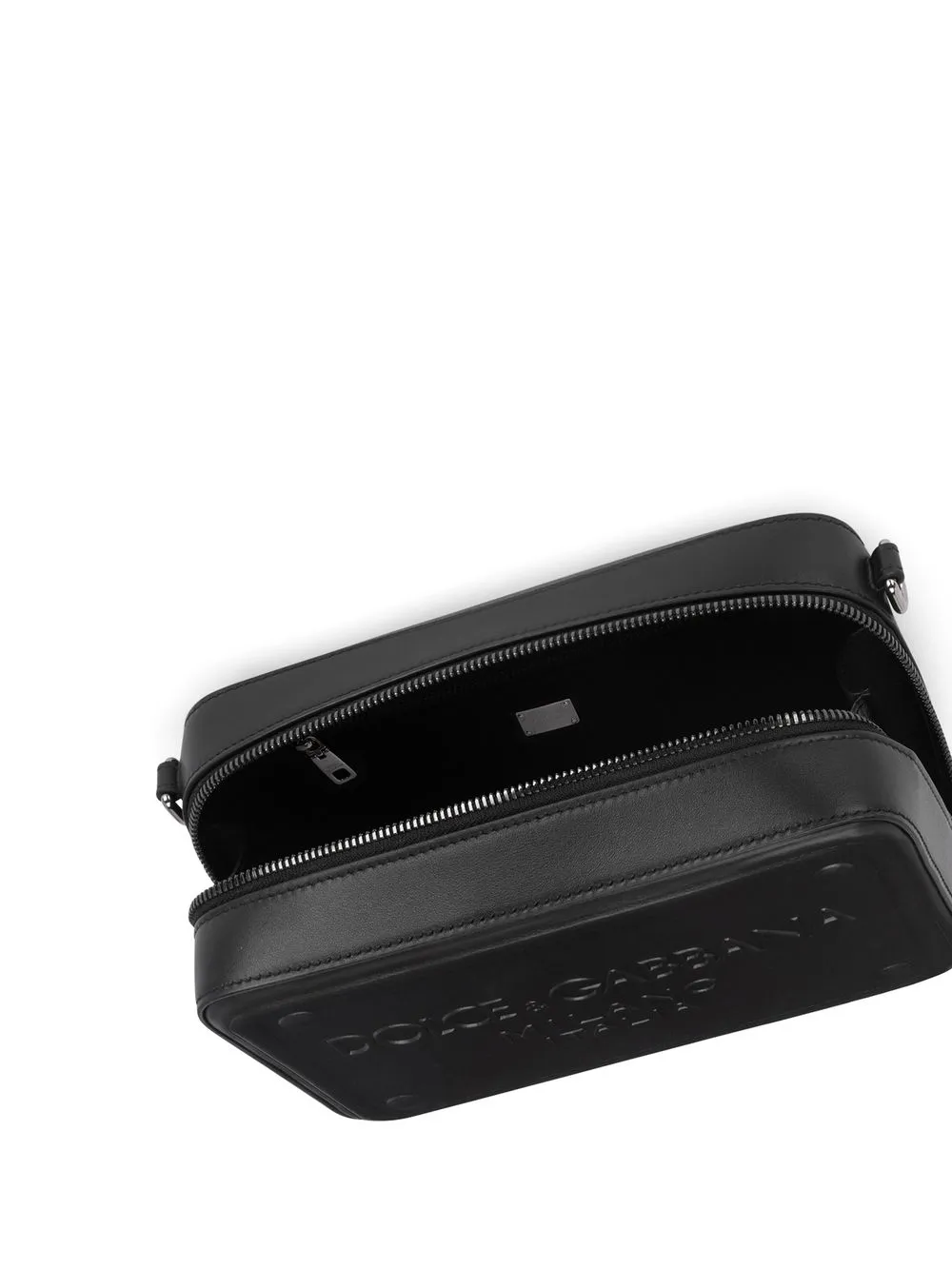 Negro, piel de becerro, logo en relieve en la parte delantera, cierre con cremallera en el tope y correa ajustable y removible para el hombro.
