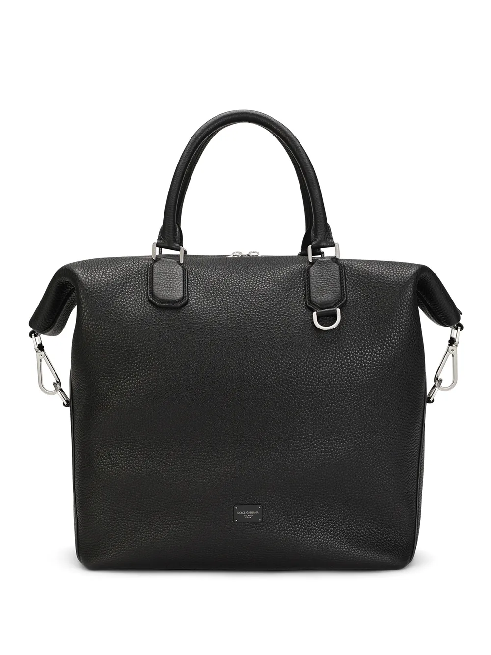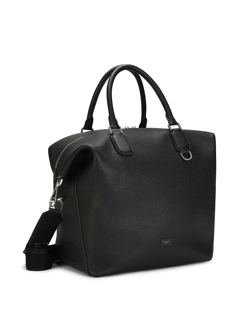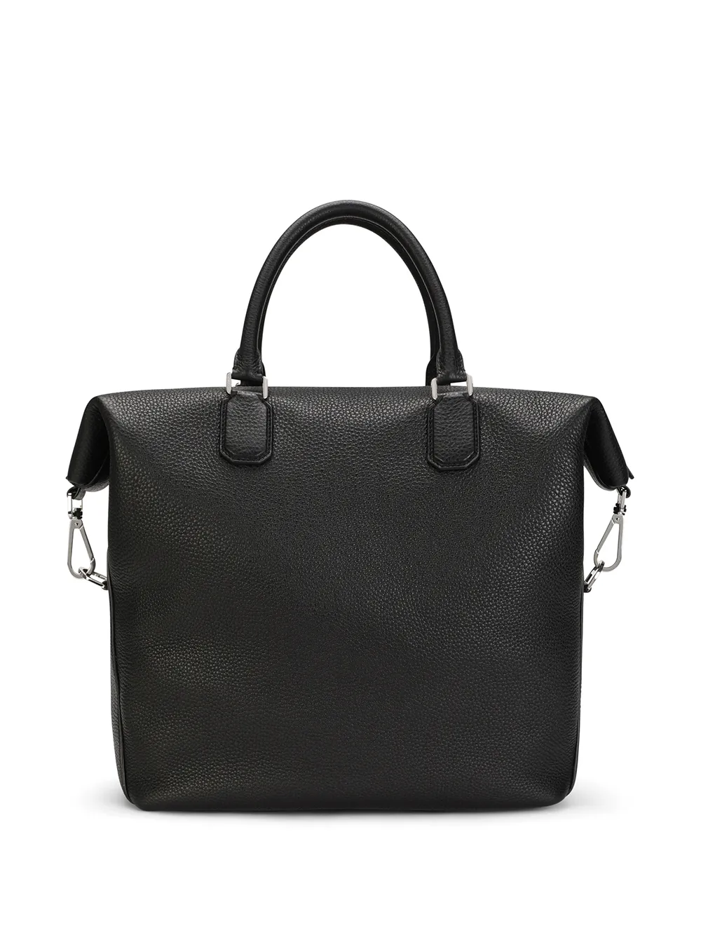 Acabado texturizado, placa del logo, diseño holgado, cierre con cremallera en el tope, dos asas redondas en la parte superior, correa ajustable y removible para el hombro, bolsillo interno con cremallera y placa del logo en el interior. Material: piel de becerro.
