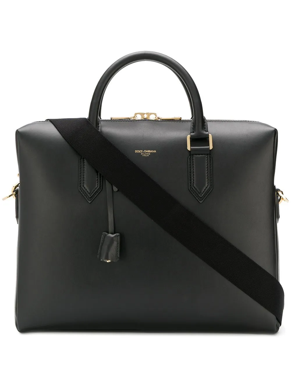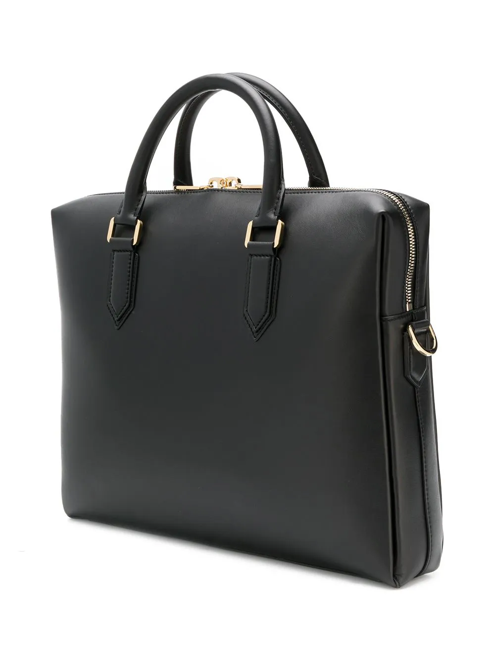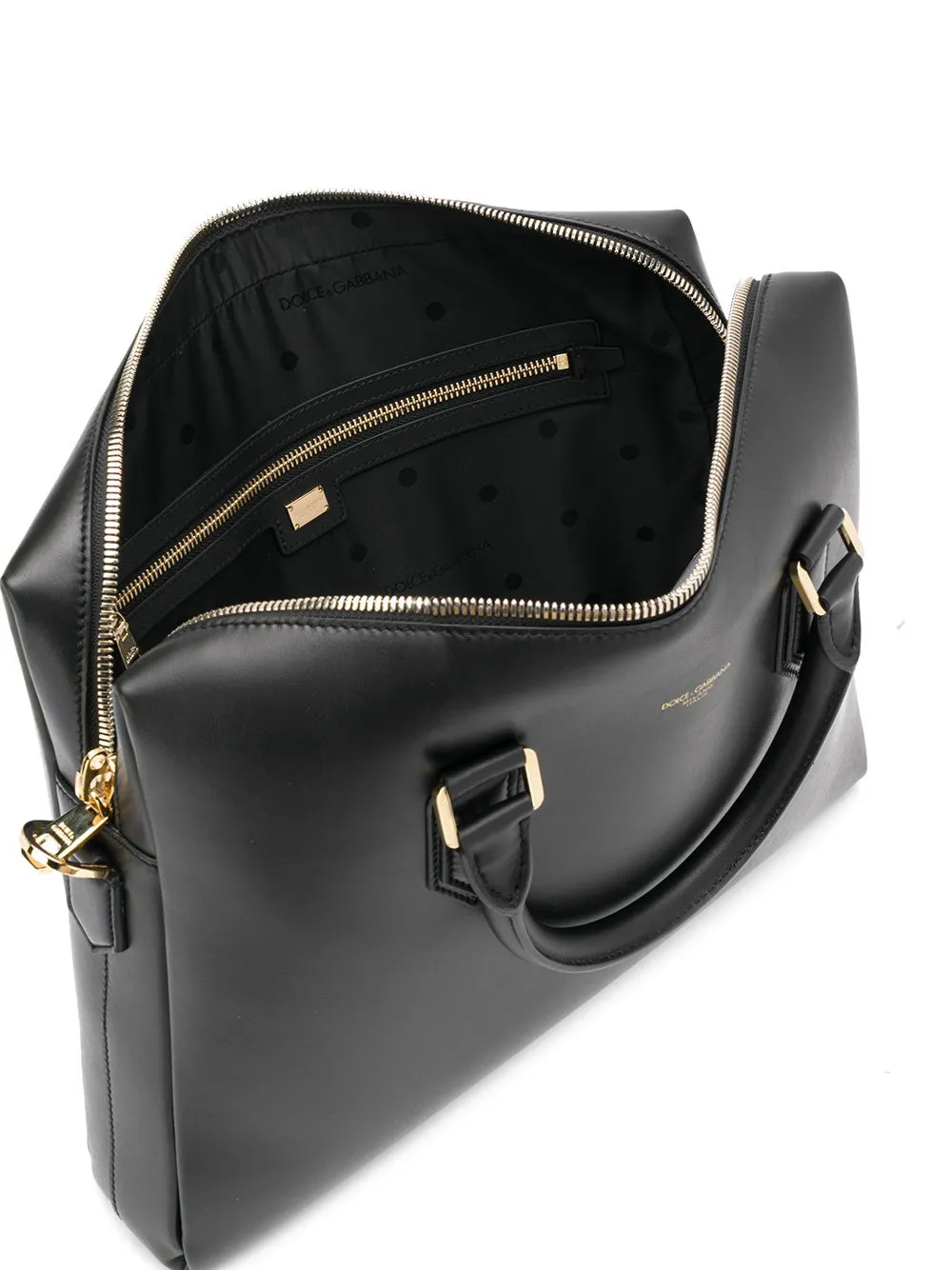 Bolso para portátil en piel de becerro de color negro de Dolce & Gabbana con correa para el hombro removible, etiqueta colgante en cuero, asas en el tope, logo en relieve en la parte delantera, cierre con cremallera en la parte de arriba, bolsillo interno con cremallera, forro a lunares y placa del logo en el interior.