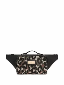 Estampado de leopardo, placa del logo, asa plana en la parte superior, cierre con cremallera en el tope, cierre con cremallera oculta en la parte trasera y correa de cintura ajustable.