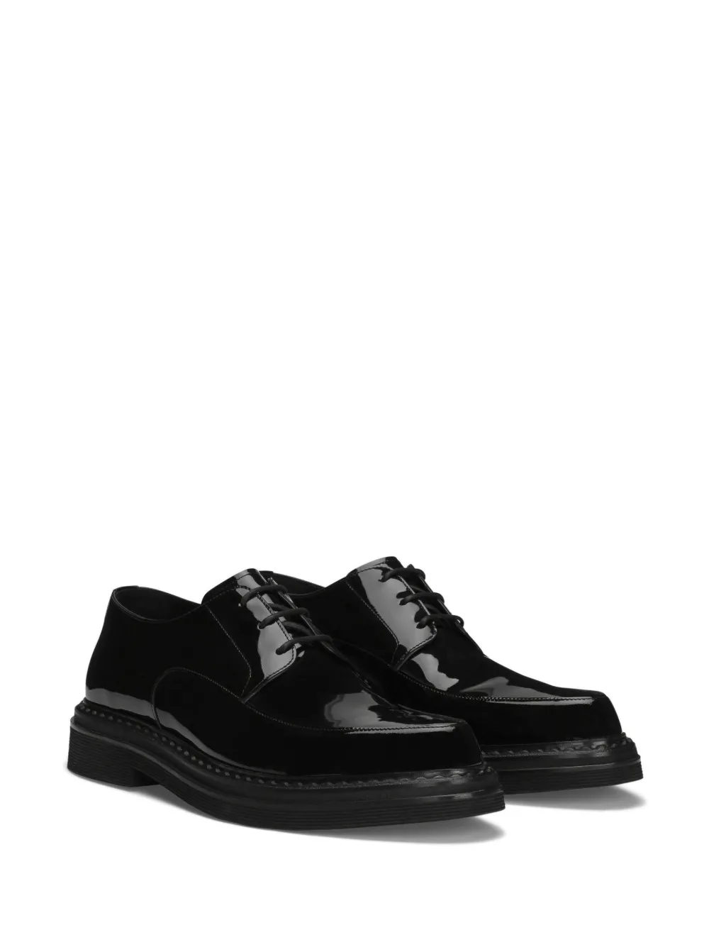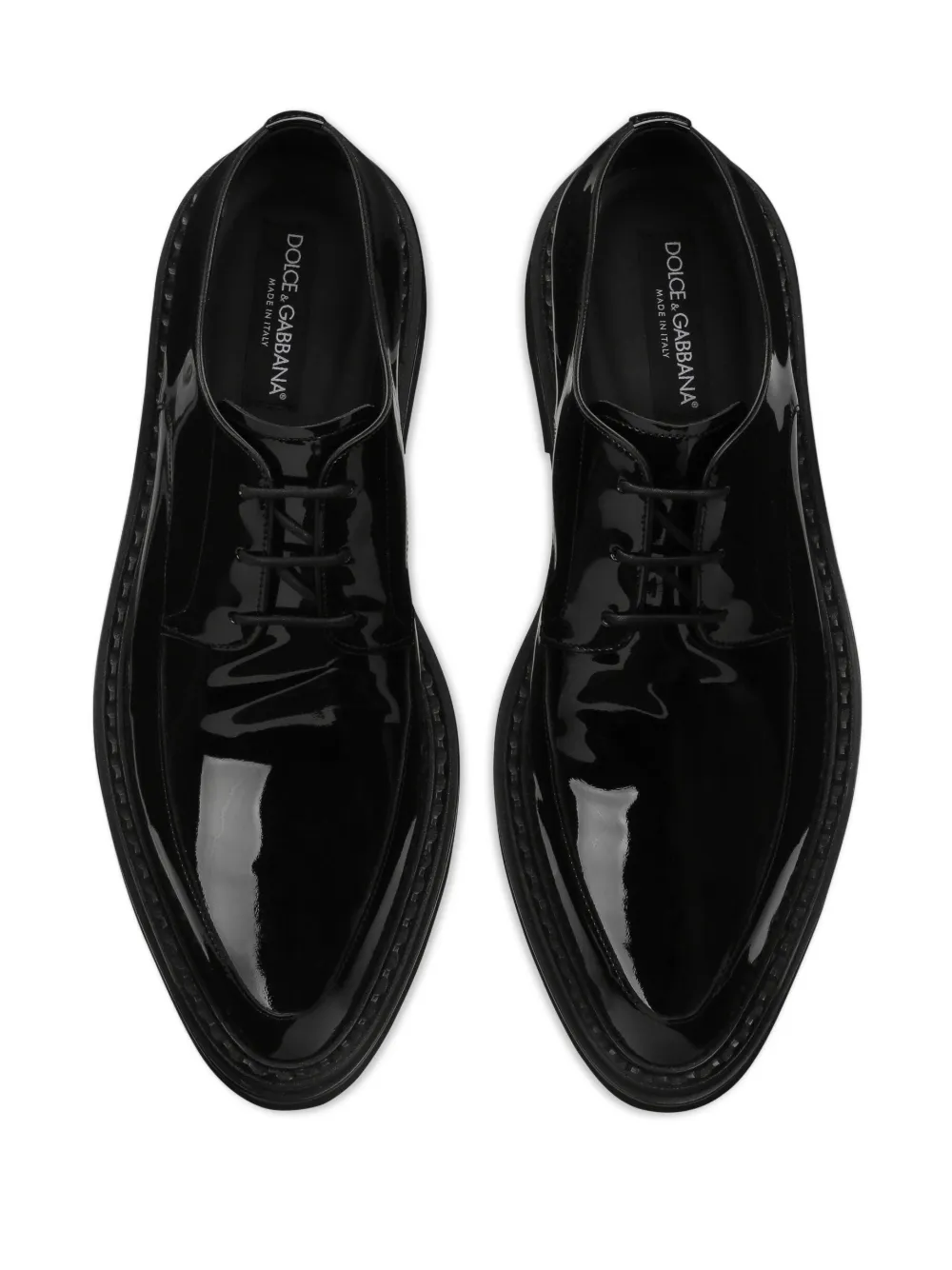 Negro, piel de becerro, acabado de charol, puntera en punta, cierre con cordones en la parte delantera y suela de goma.