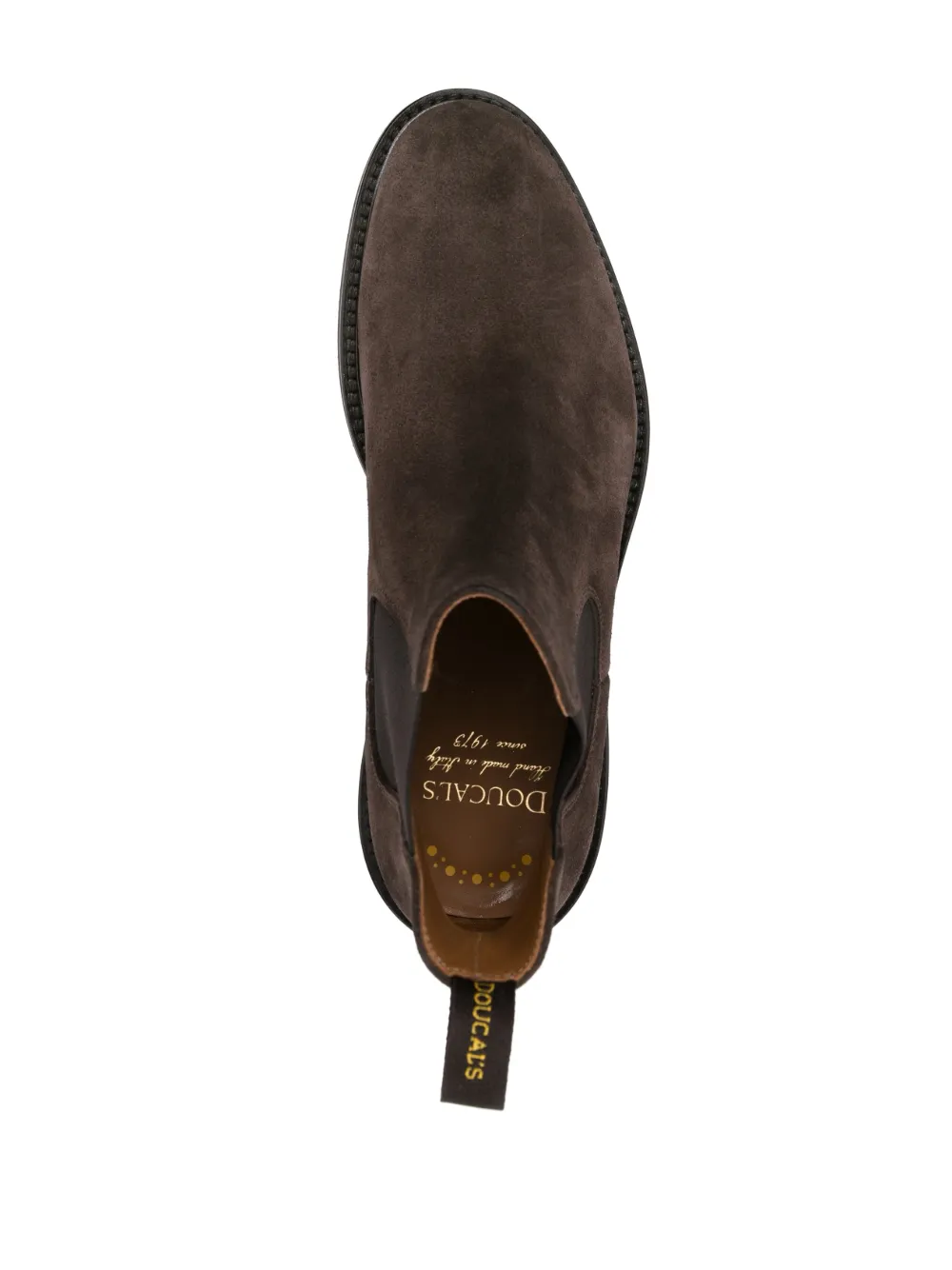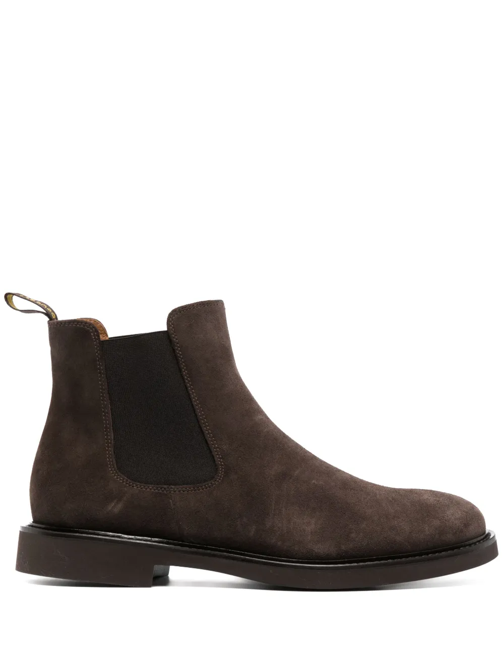 Marrón cedro, ante de becerro, piel de becerro, paneles laterales elásticos, puntera de almendra, diseño por el tobillo, lengüeta con logo en la parte posterior, plantilla de piel con logo y suela plana de goma.