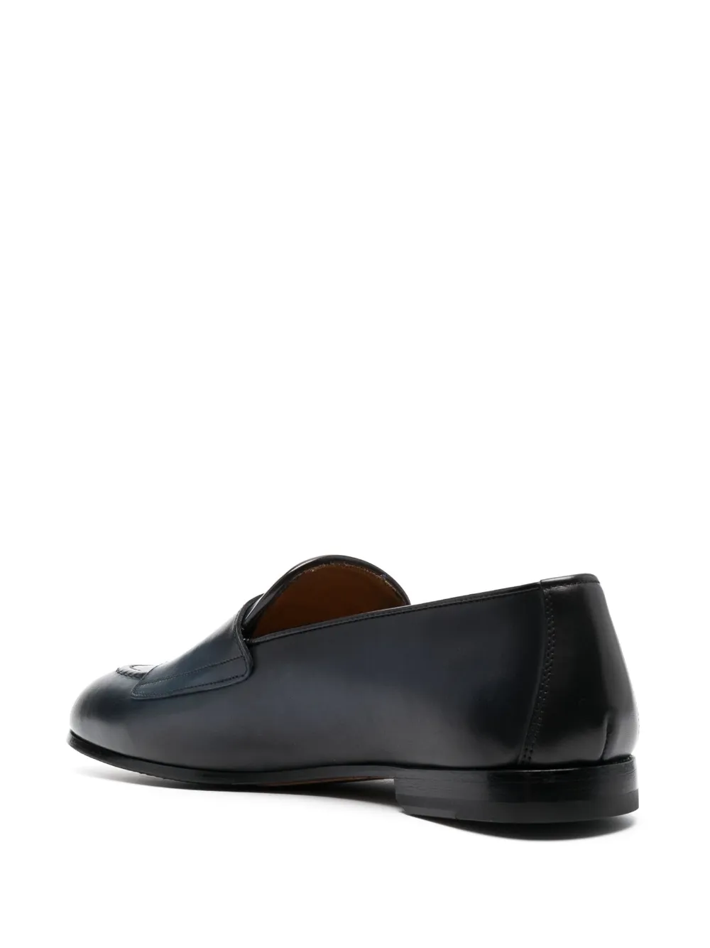 Azul marino, piel de becerro, correa estilo monk, puntera de almendra, cierre con hebilla doble, plantilla con logo y suela plana.