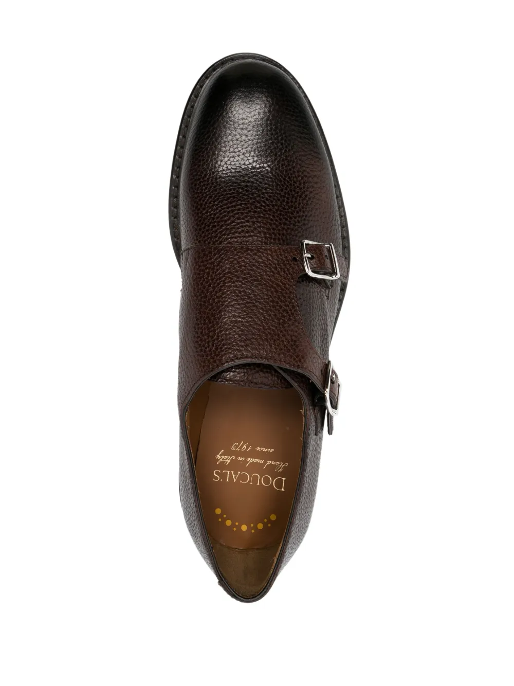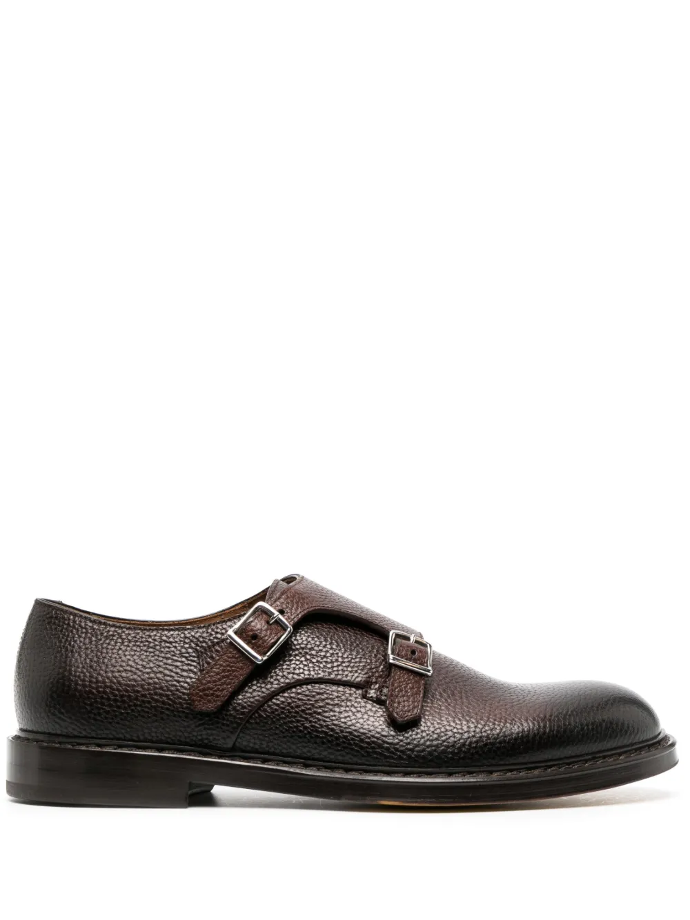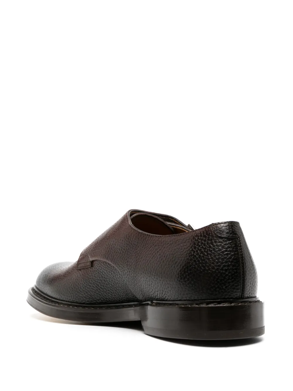 Marrón cedro, piel de becerro, textura granulada, cierre con hebilla, plantilla con logo, tacón cuadrado bajo y puntera redonda.
